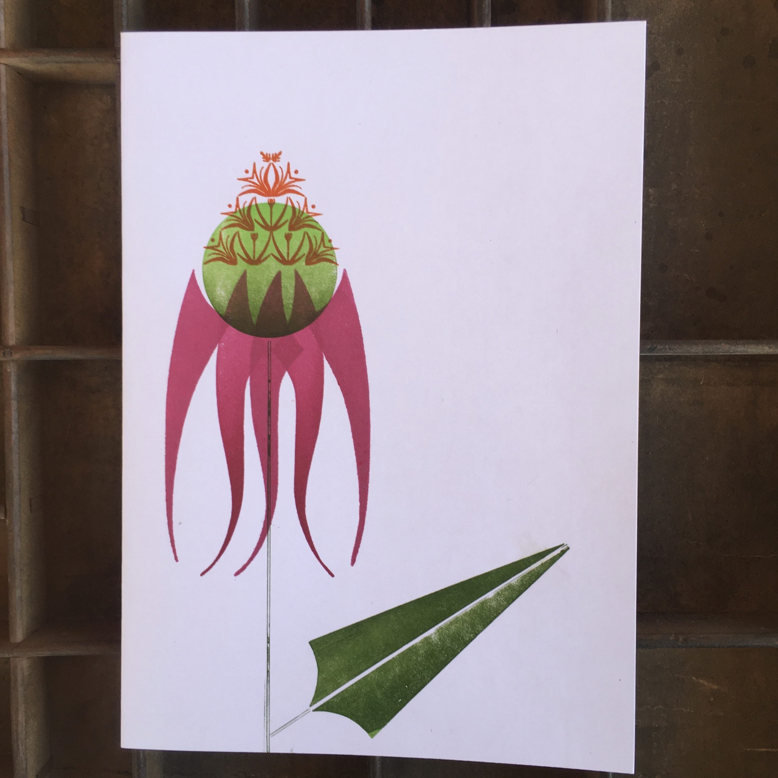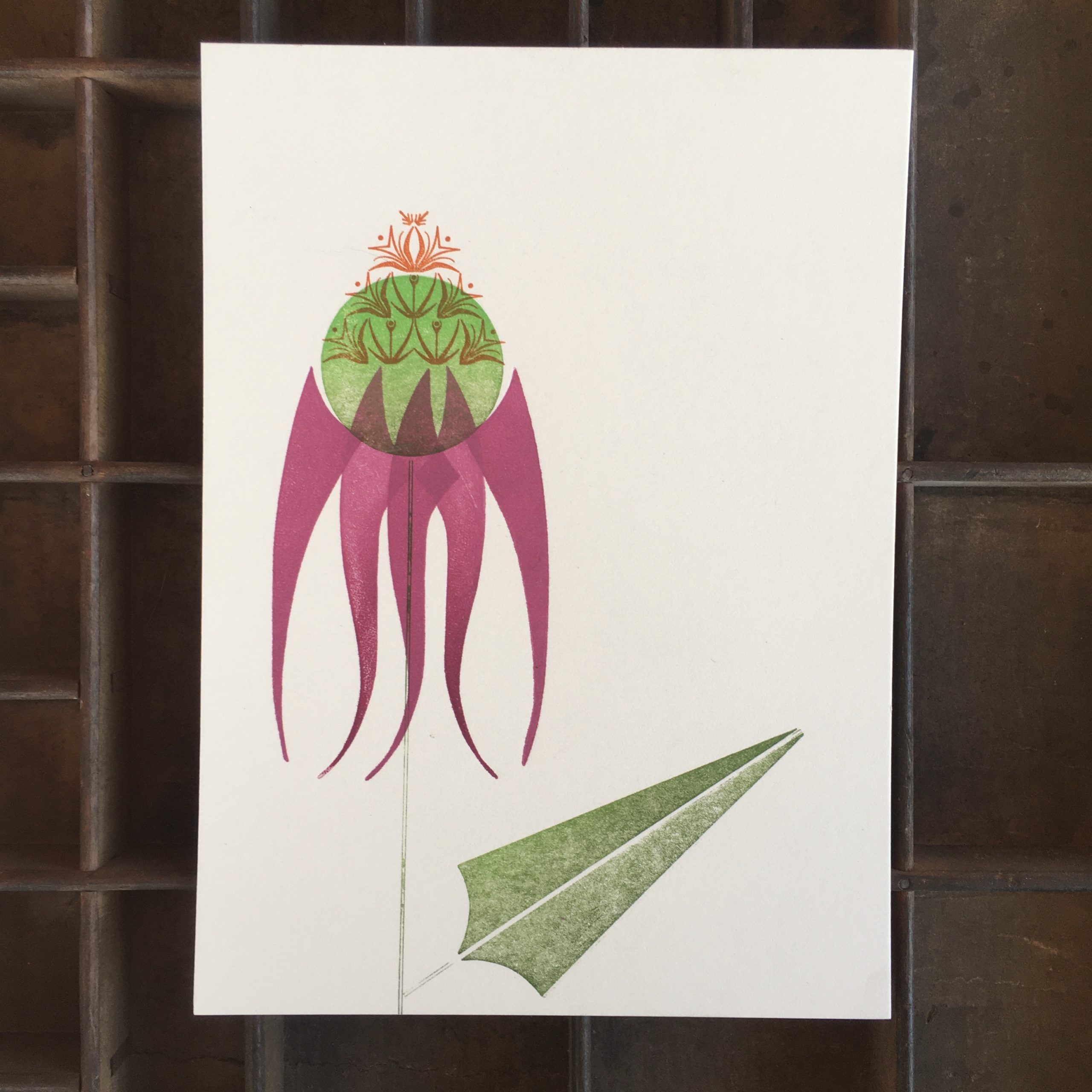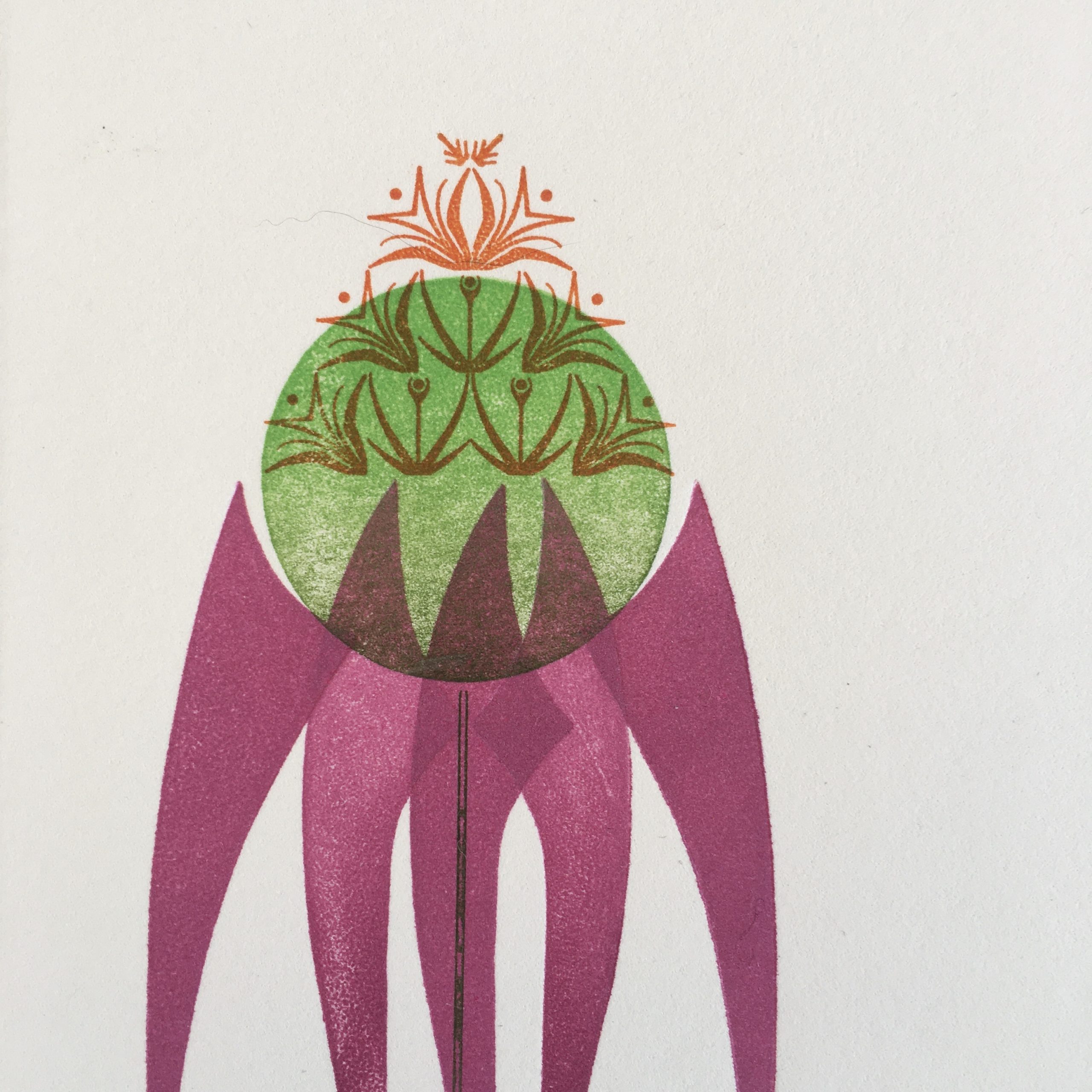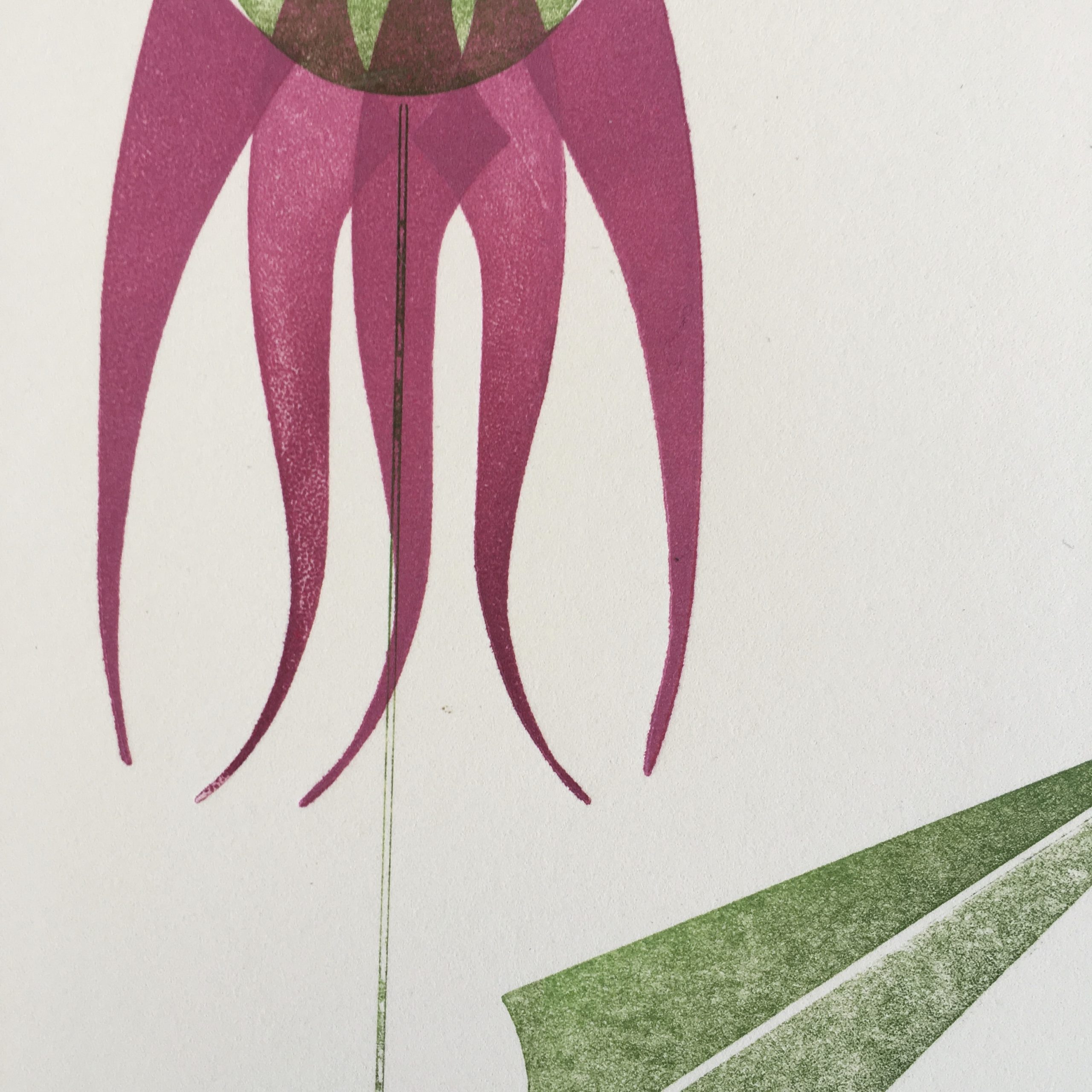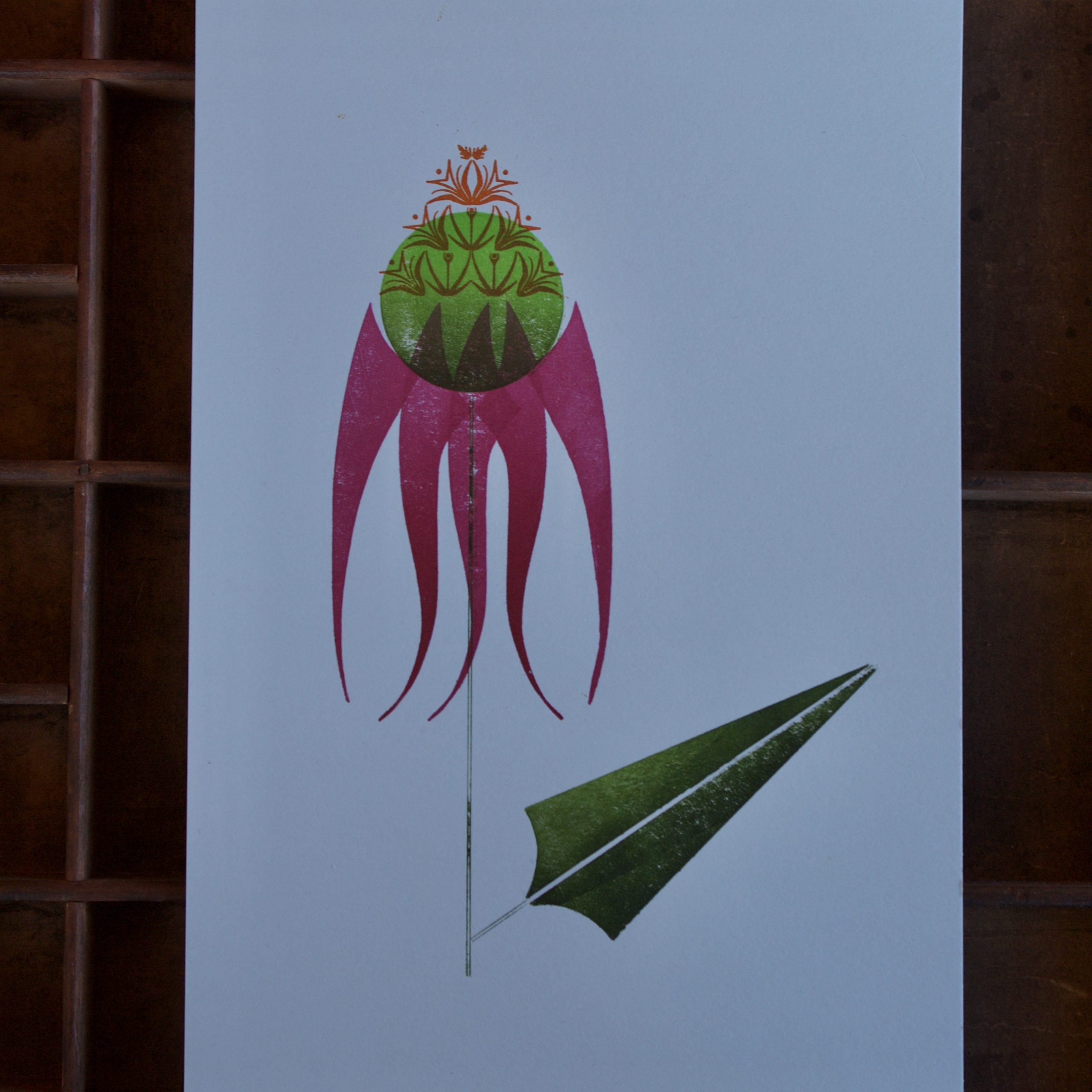 A Purple Coneflower, Echinacea Purpurea, rendered in a three color print using wood and metal type ornaments.