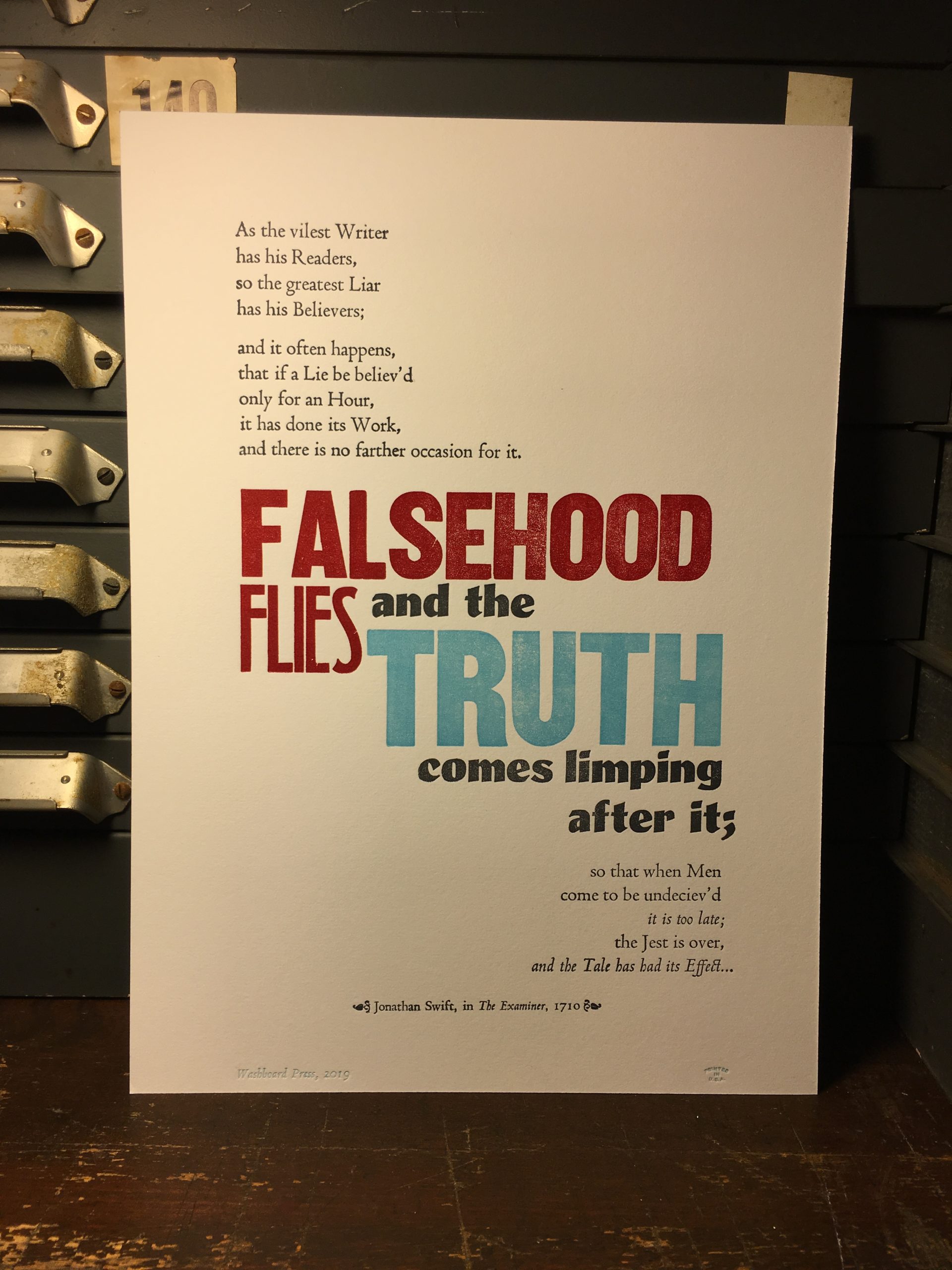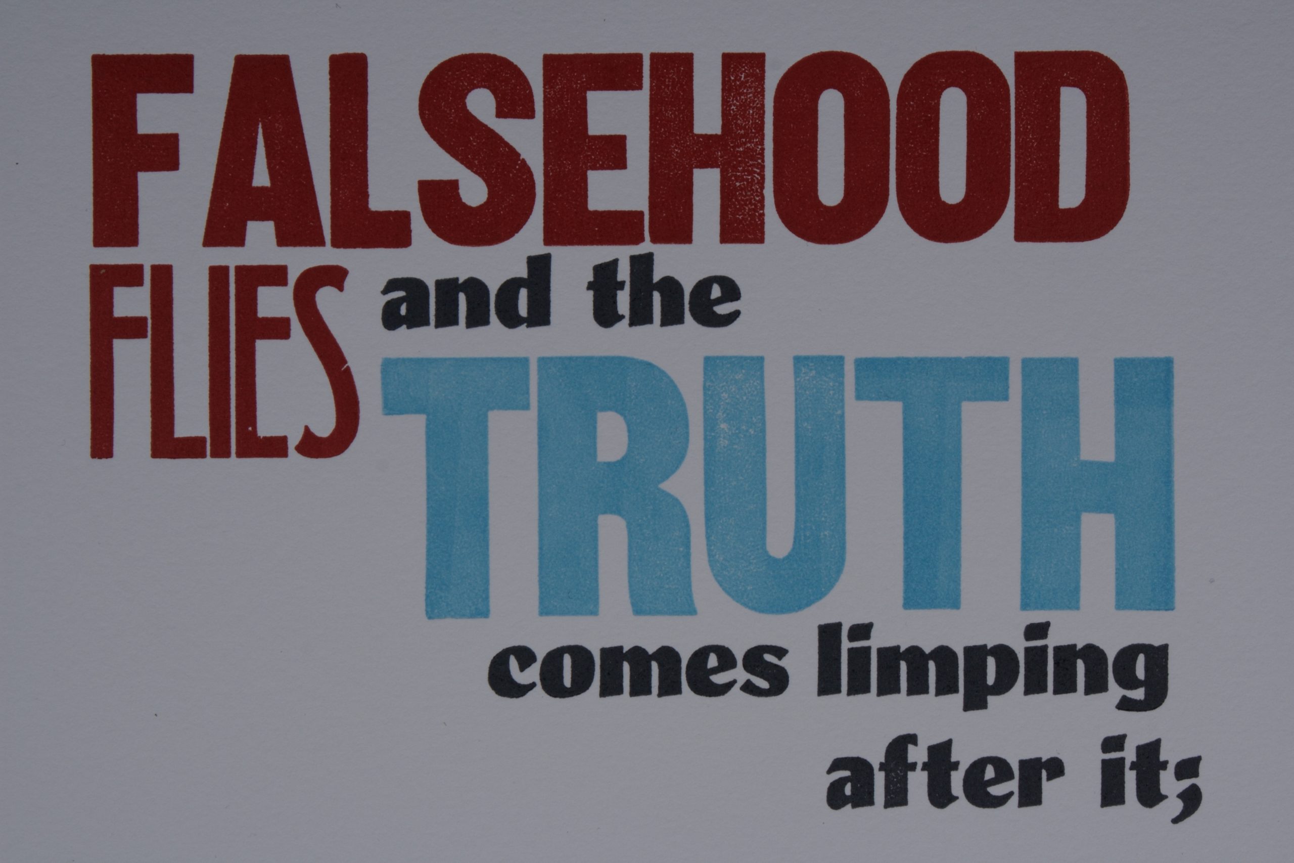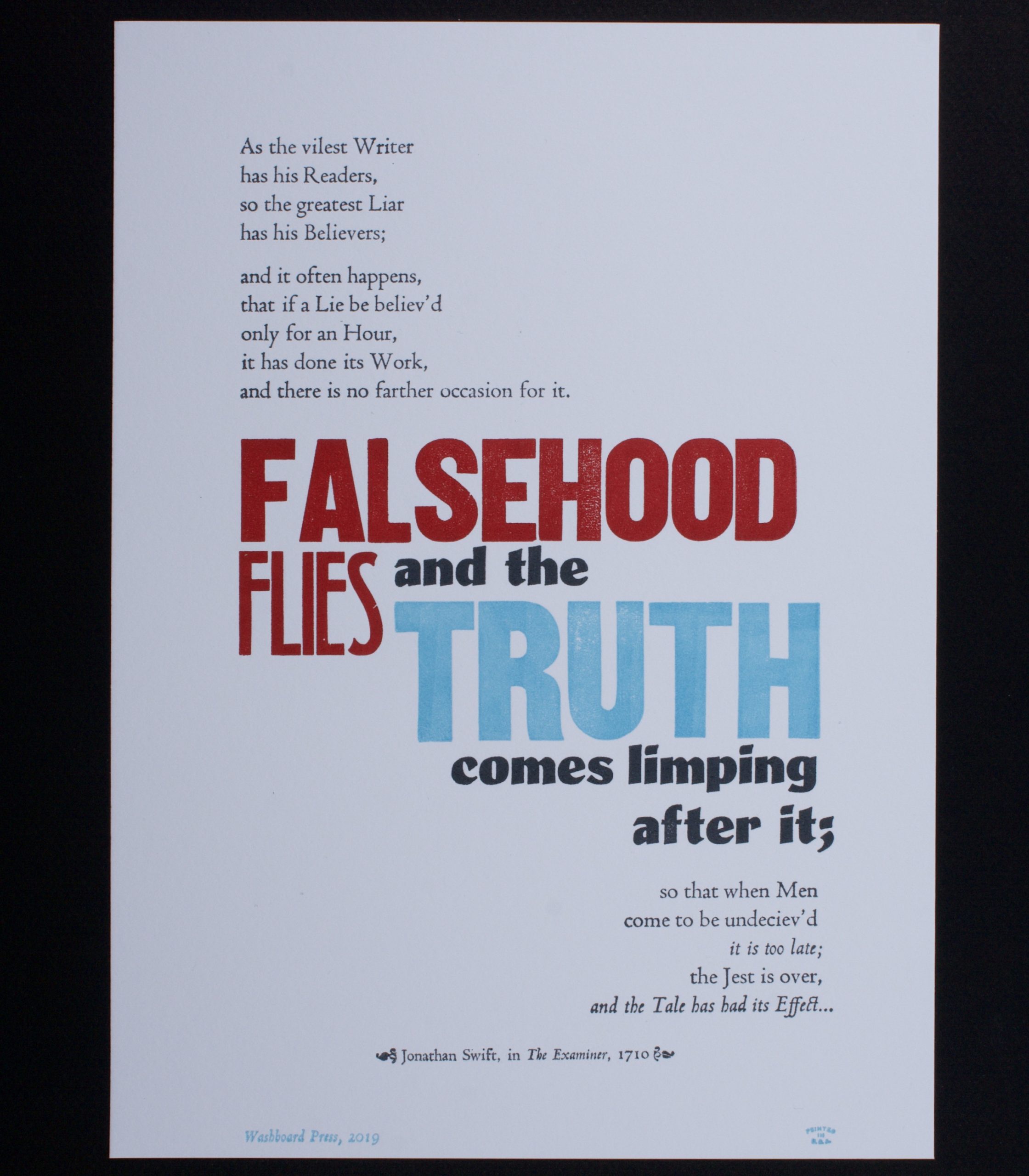 Art print with quote from Jonathan Swift: “Falsehood flies, and the Truth comes limping after it…” Originally written in 1710, but as relevant as ever today—maybe even more so.