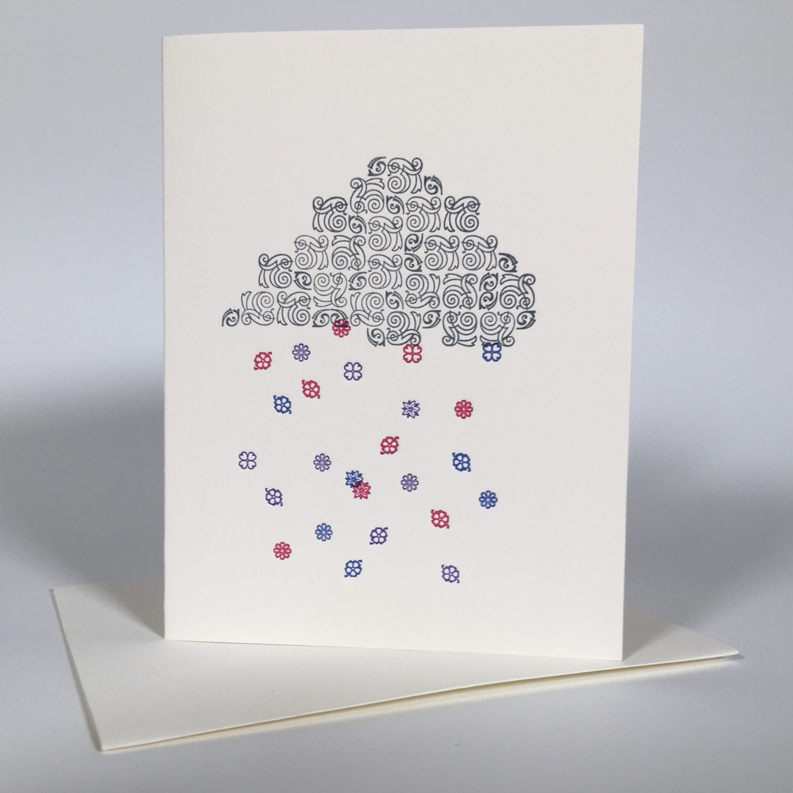 A shower of flowers falls gently from the clouds. Is it a freak meteorological event? An Omen? A miracle? A sign of spring coming? Suitable for a wedding or baby shower, or other occasions you want to observe with a little whimsy or mystery. Part of the Heavy Weather series of cards.4 color letterpress printed on 118# heavyweight cream cotton card stock. A2 sized (5.5″ x 4.25″) folded card with blank interior and matching envelope. Printed by hand in Madison, Wisconsin using hand-composed modern metal type.