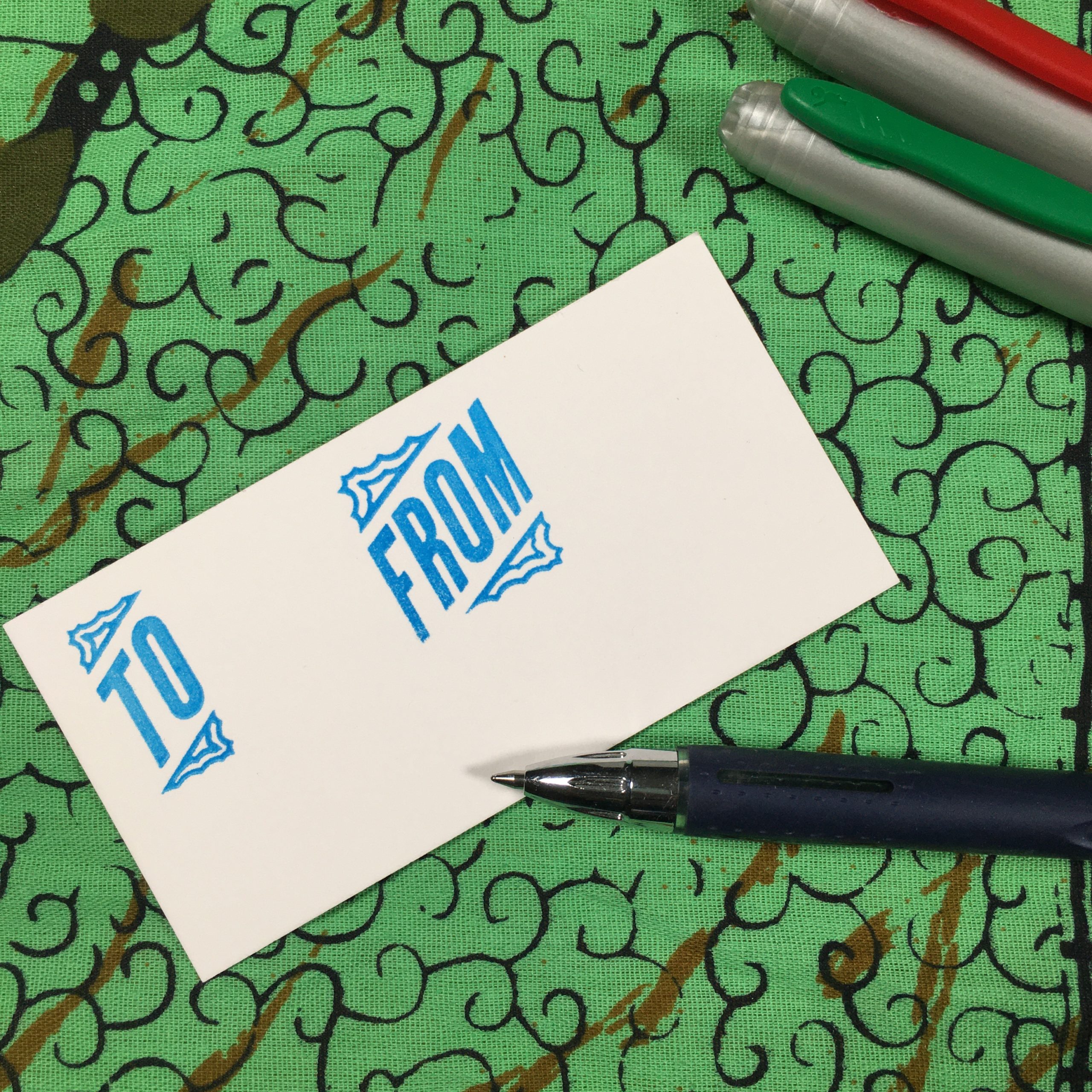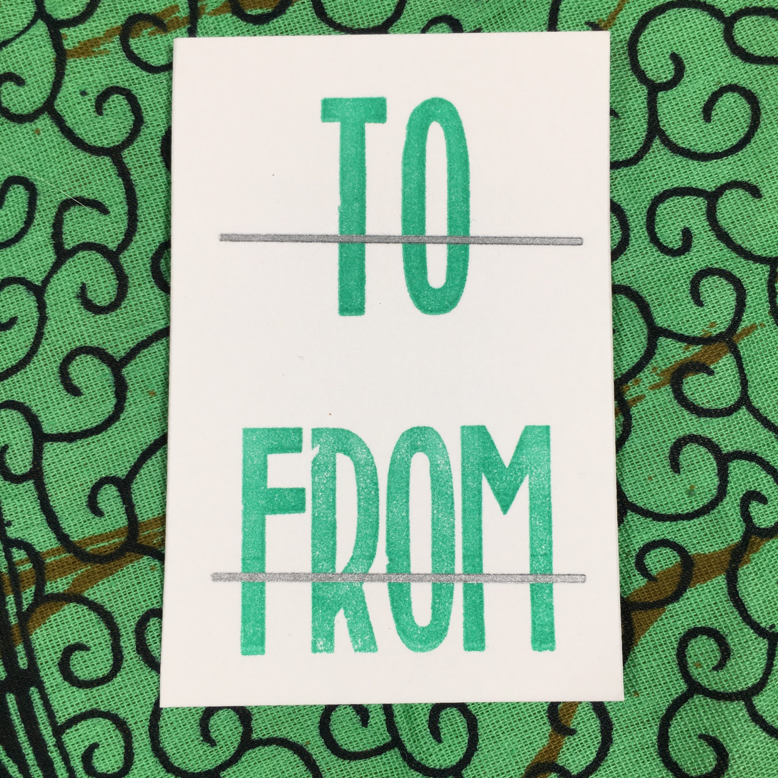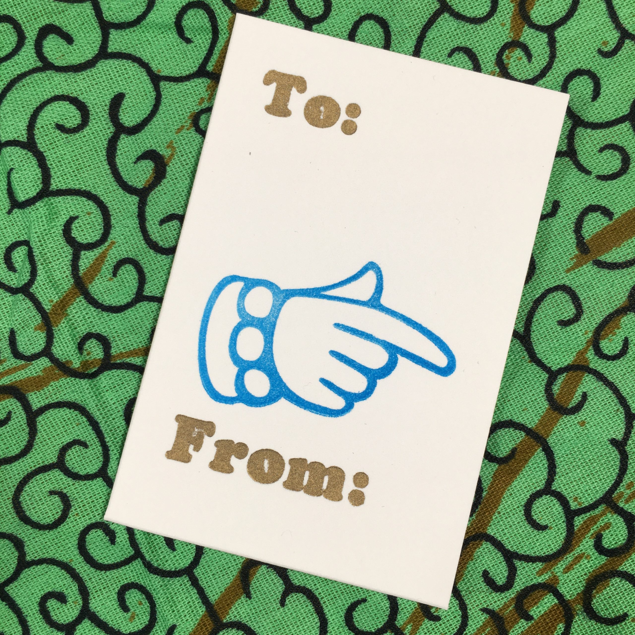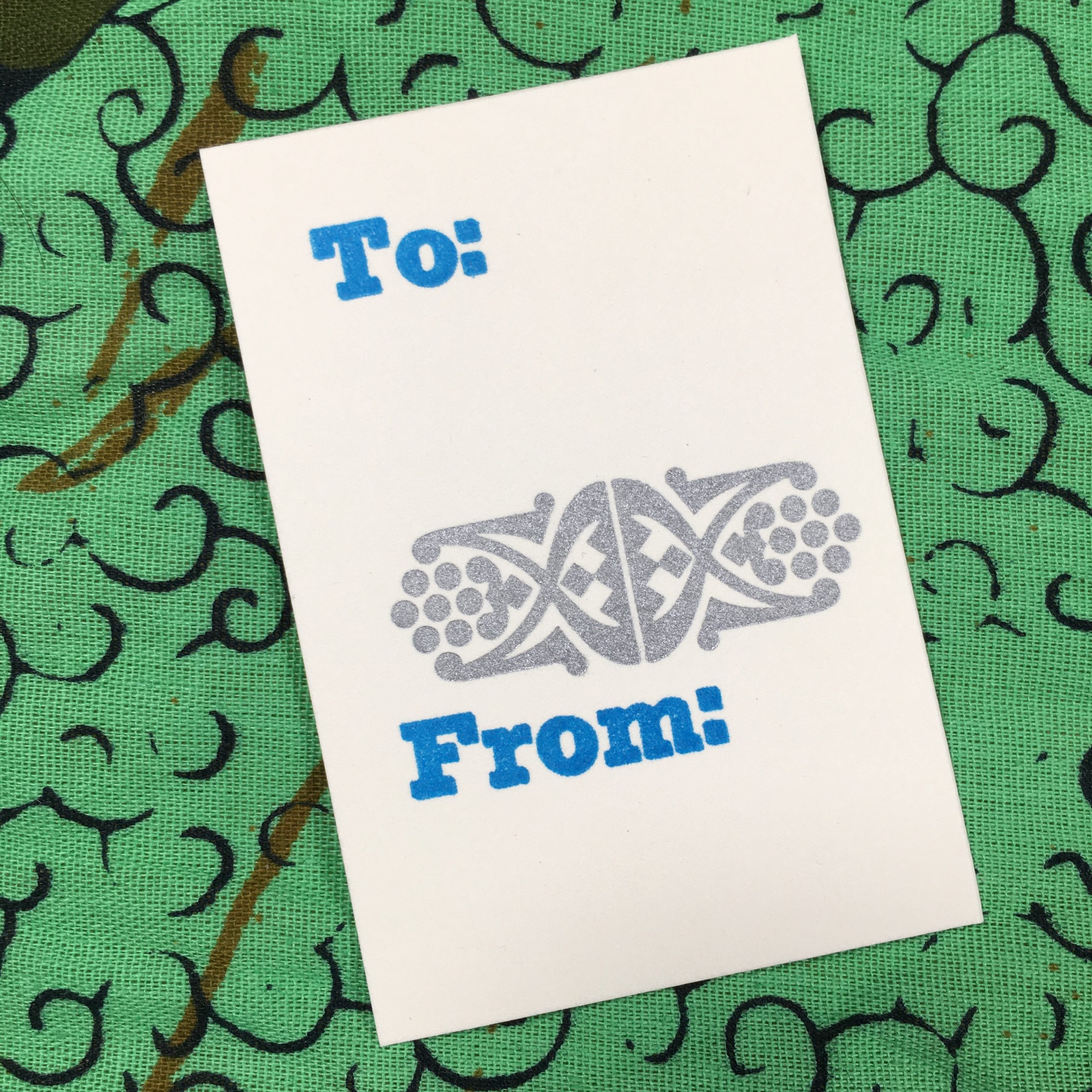 A whole array of gift tags, all letter press printed by hand using metal type and wood type ornaments in two colors. Sold in bundles of five all identical, or in a set of 12 different tags–perfect for matching each tag to the recipient! All printed on white or cream heavyweight cotton paper.