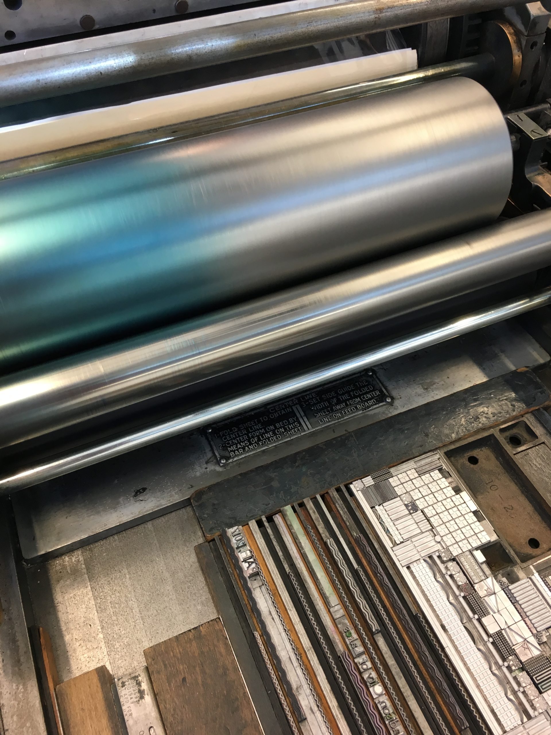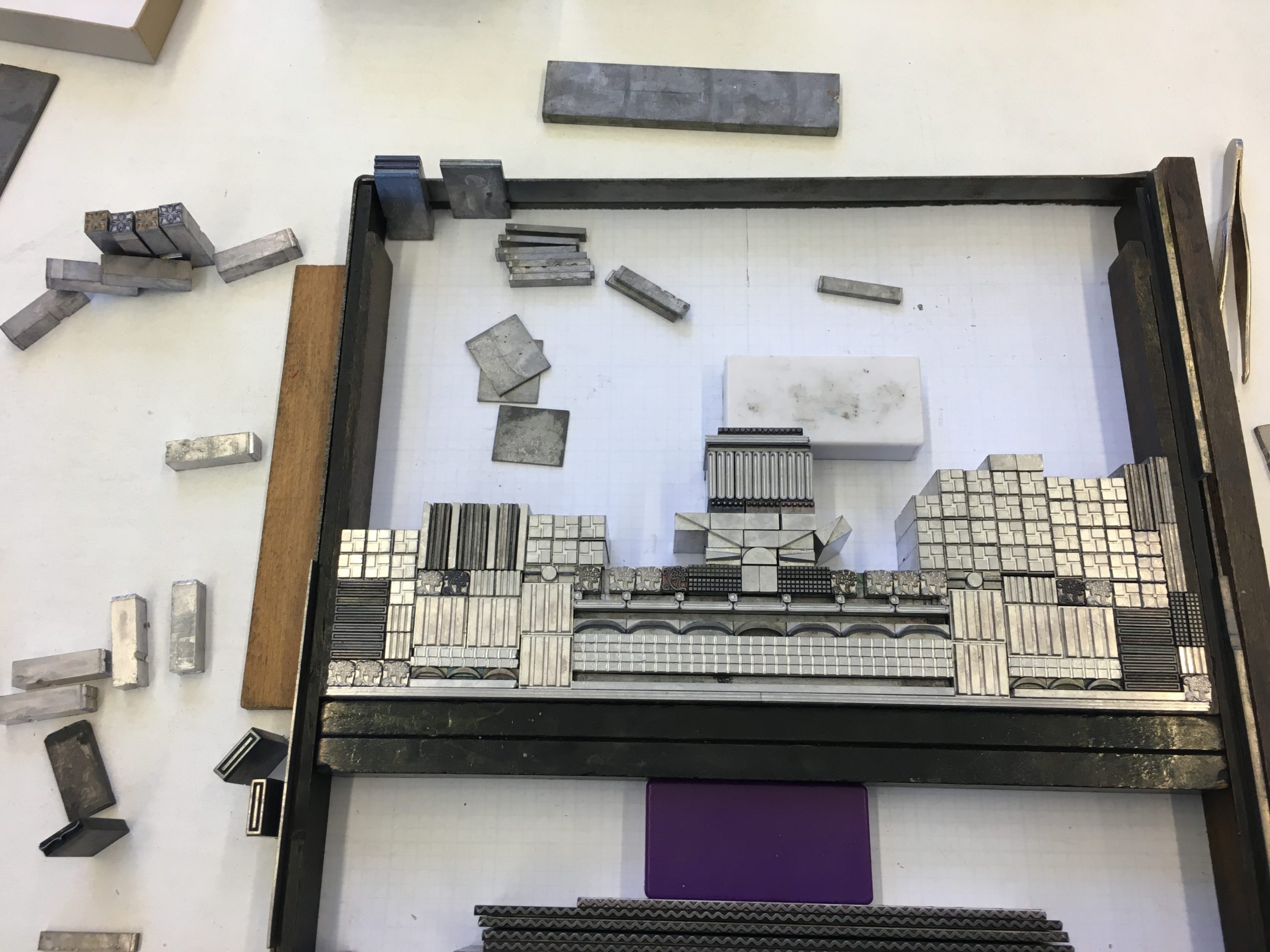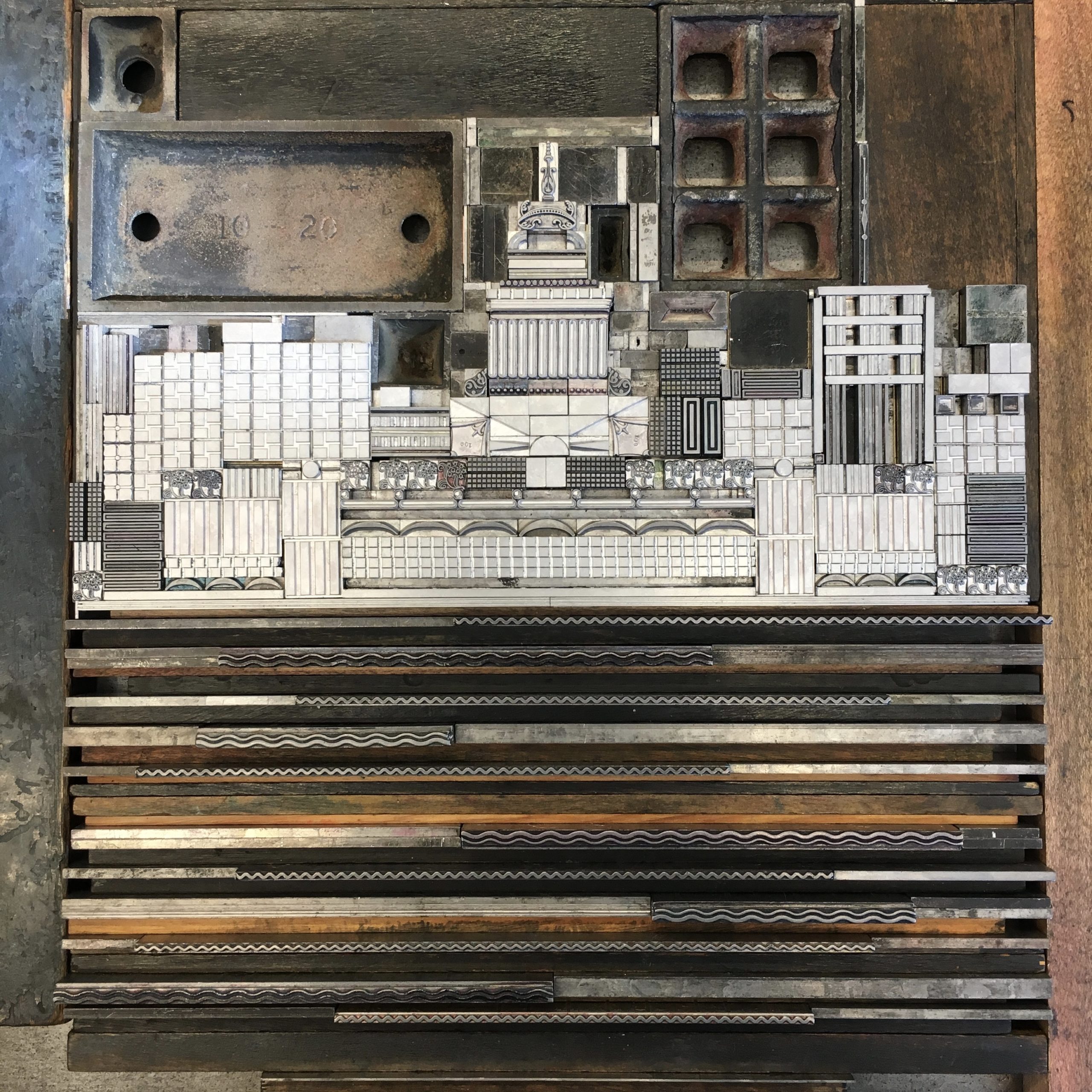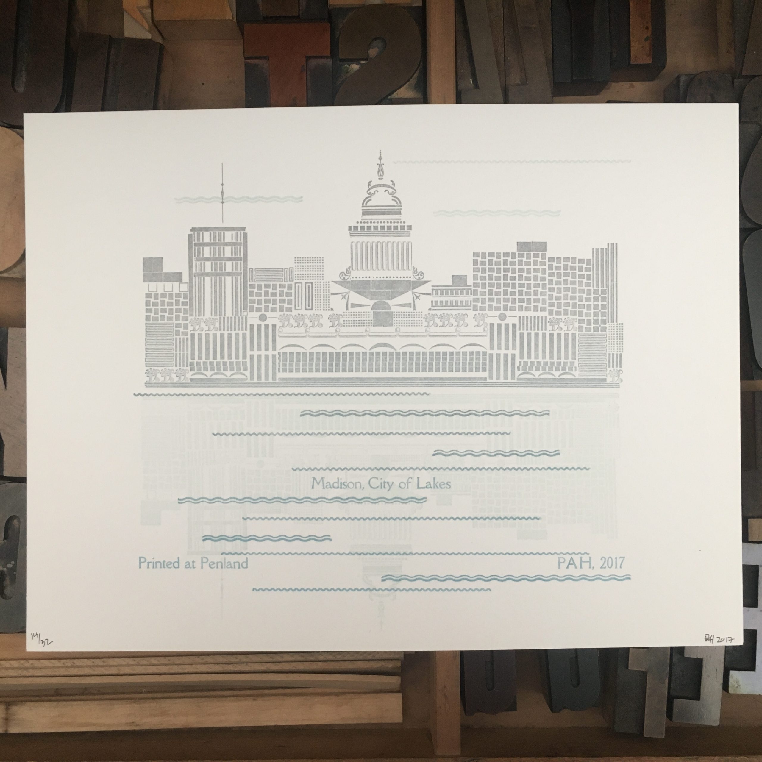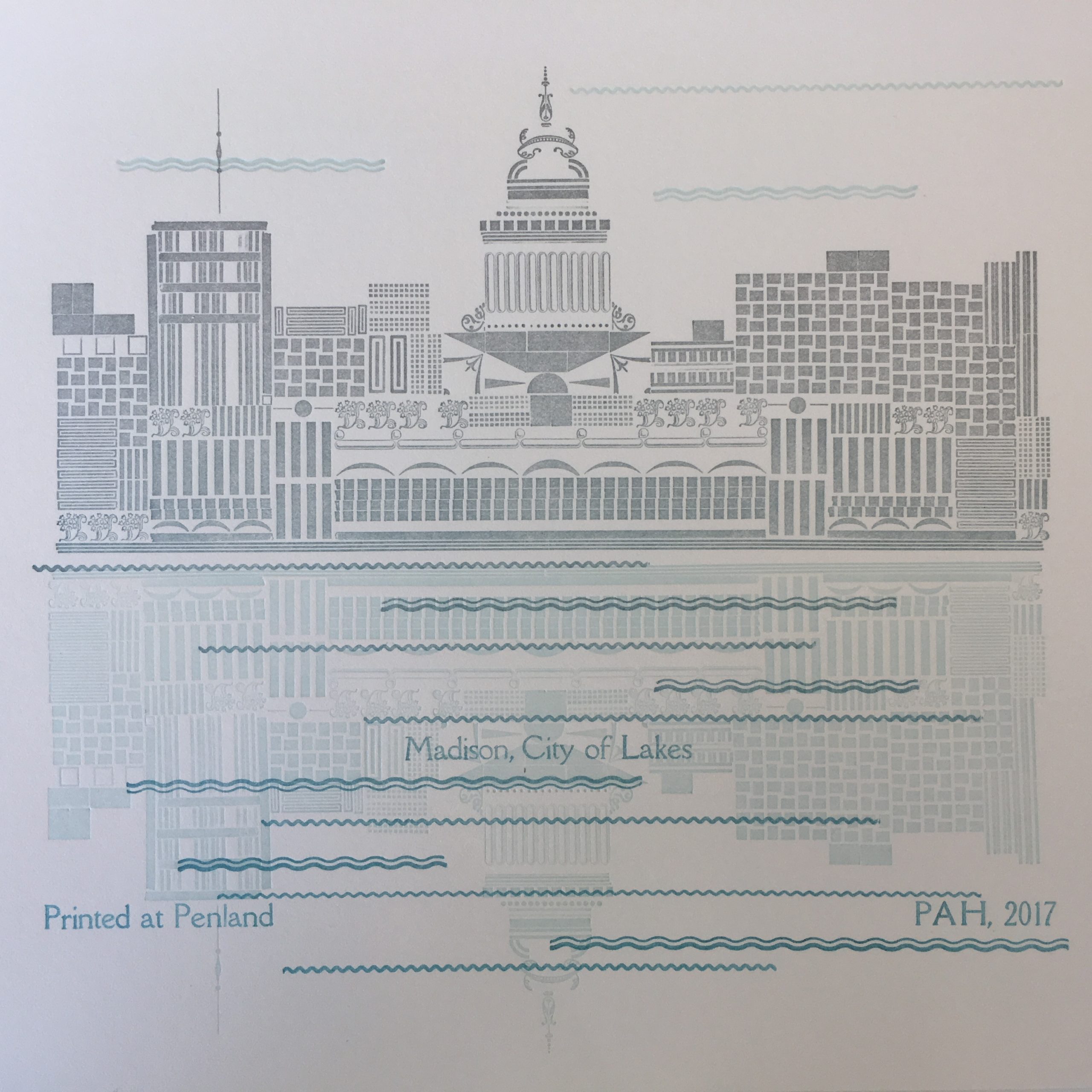 A view of downtown Madison, Wisconsin from Lake Monona, including the Monona Terrace conference center and the Wisconsin State Capital dome. Constructed by hand entirely from metal type ornaments, and then the form was taken apart and reassembled in mirror image to get the reflection in the lake.