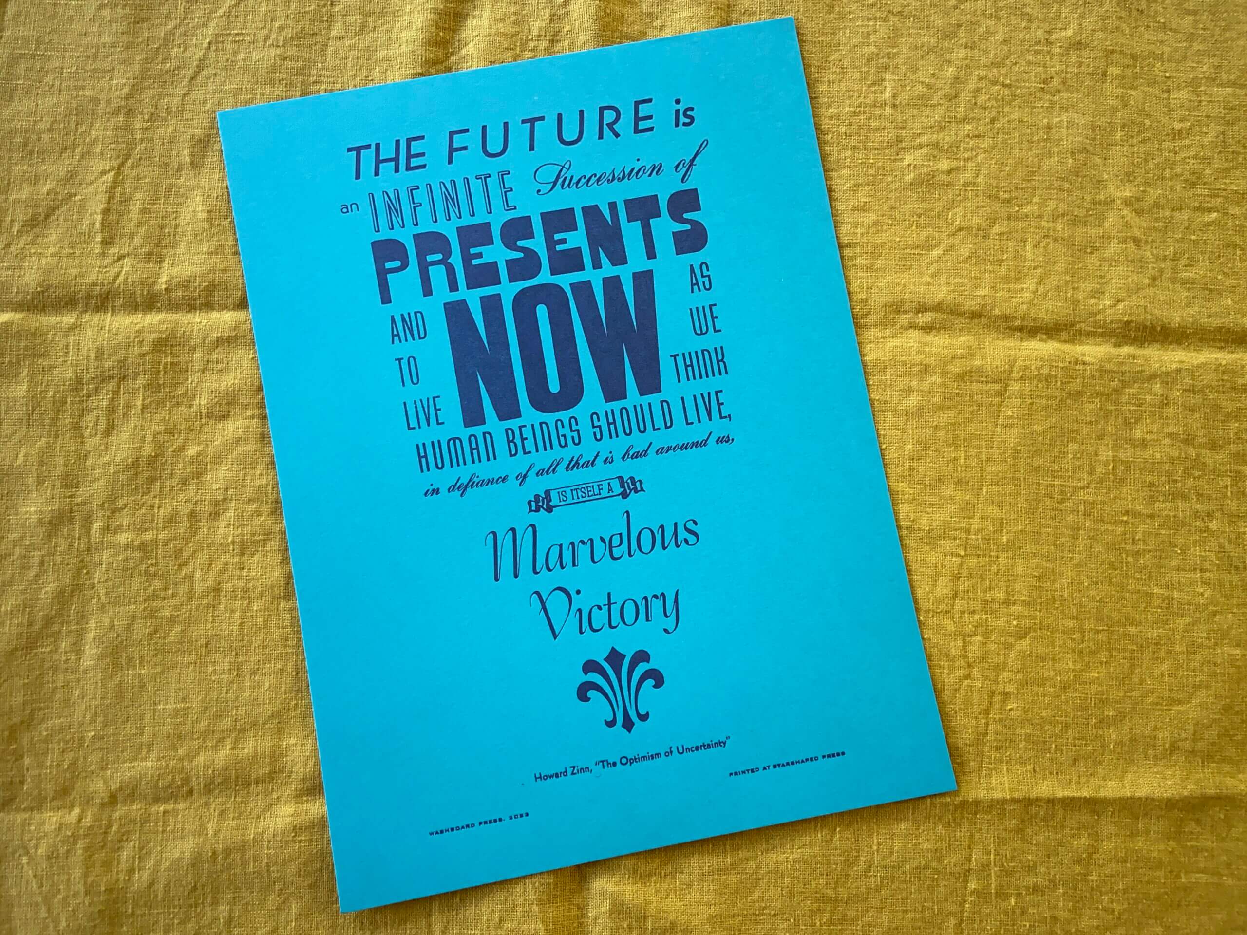 This quote from the Howard Zinn Essay “The Optimism of Uncertainty” was set and printed by me during a visit to Starshaped Press in Chicago using the amazing collection of historic wood and metal type there. 9”x12” original letterpress print on blue 80# cover stock.
