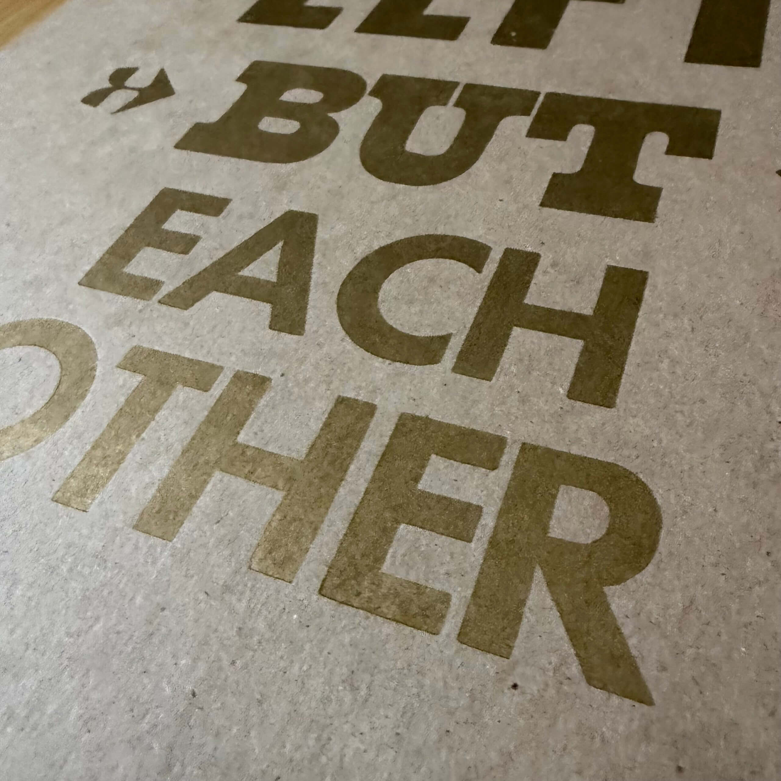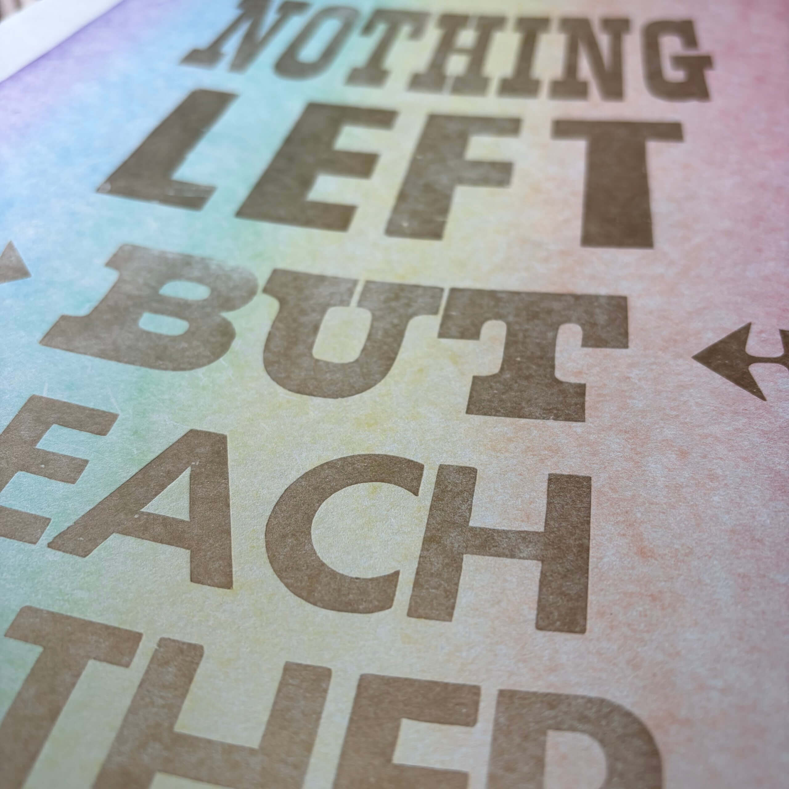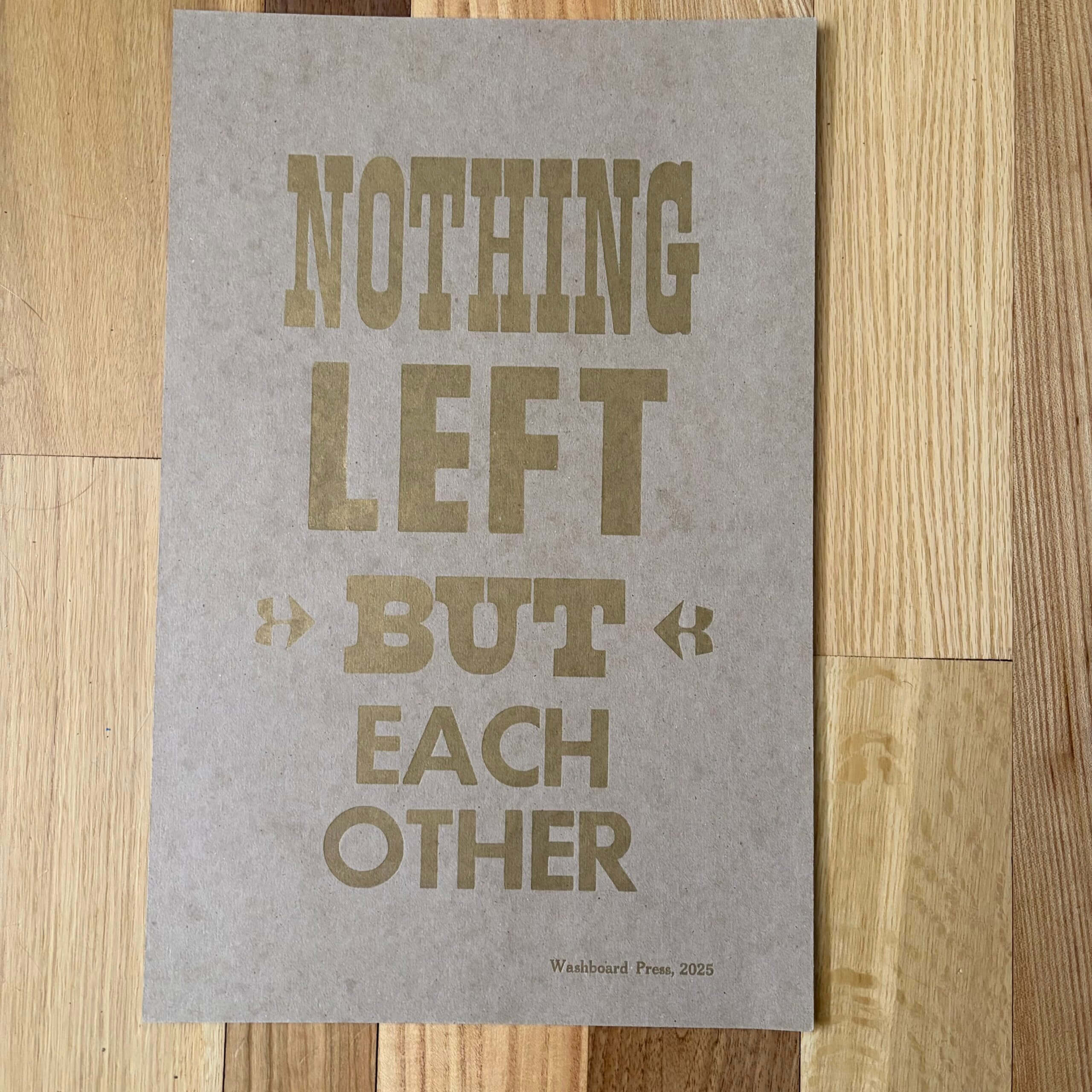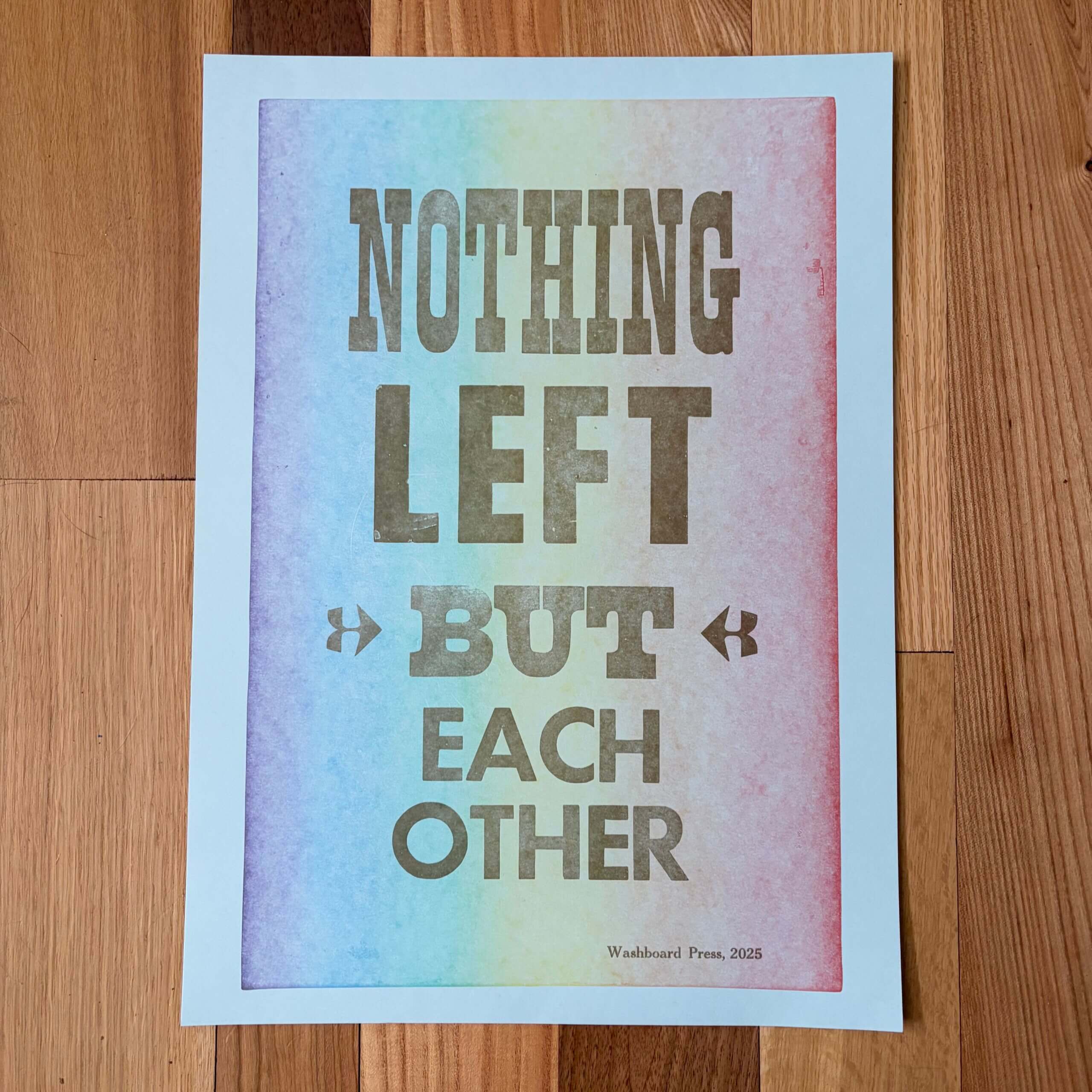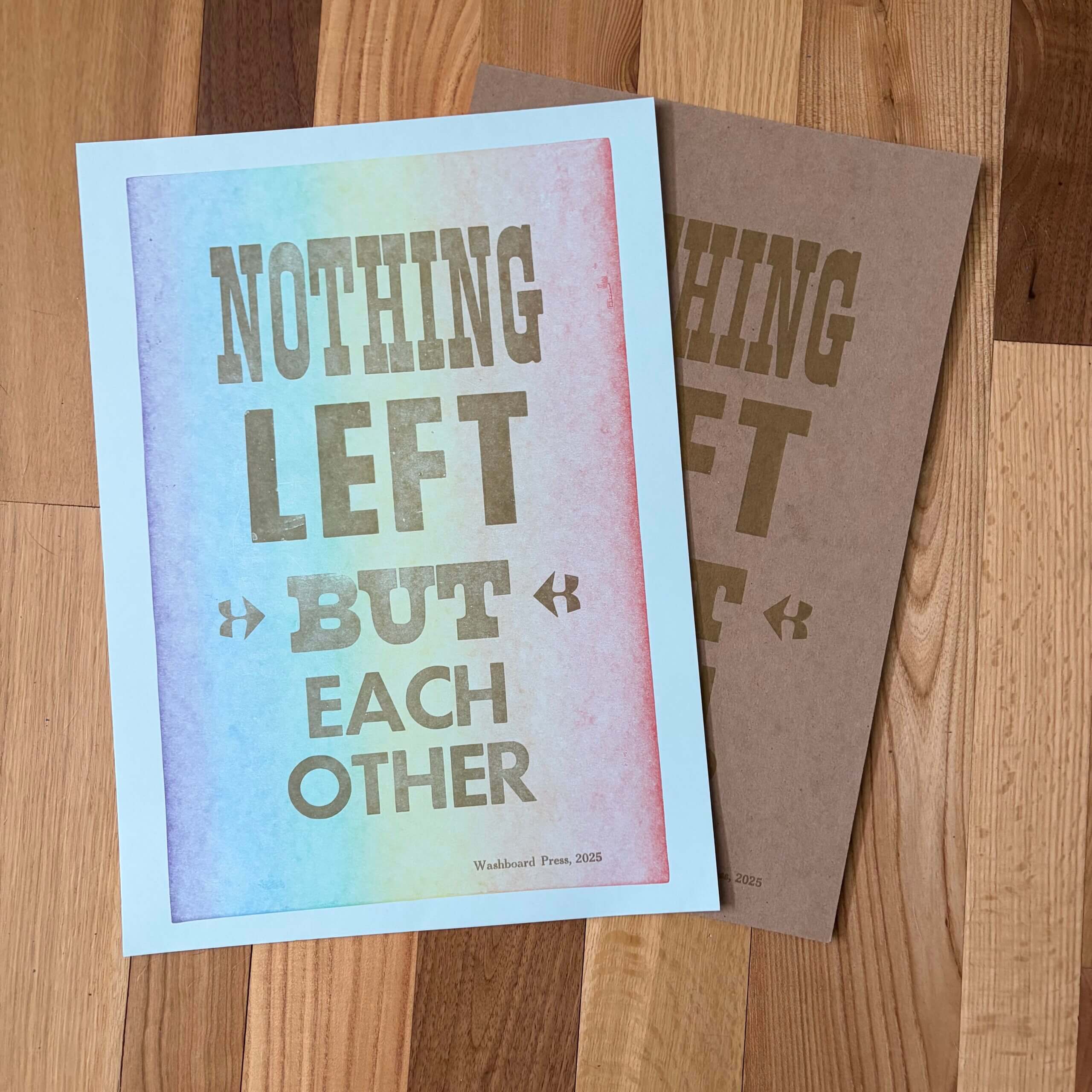 Original letterpress print. Both versions are in metallic gold ink. The blue version is printed on 80# cover stock with a rainbow gradient background, and the chipboard version is printed on chipboard.