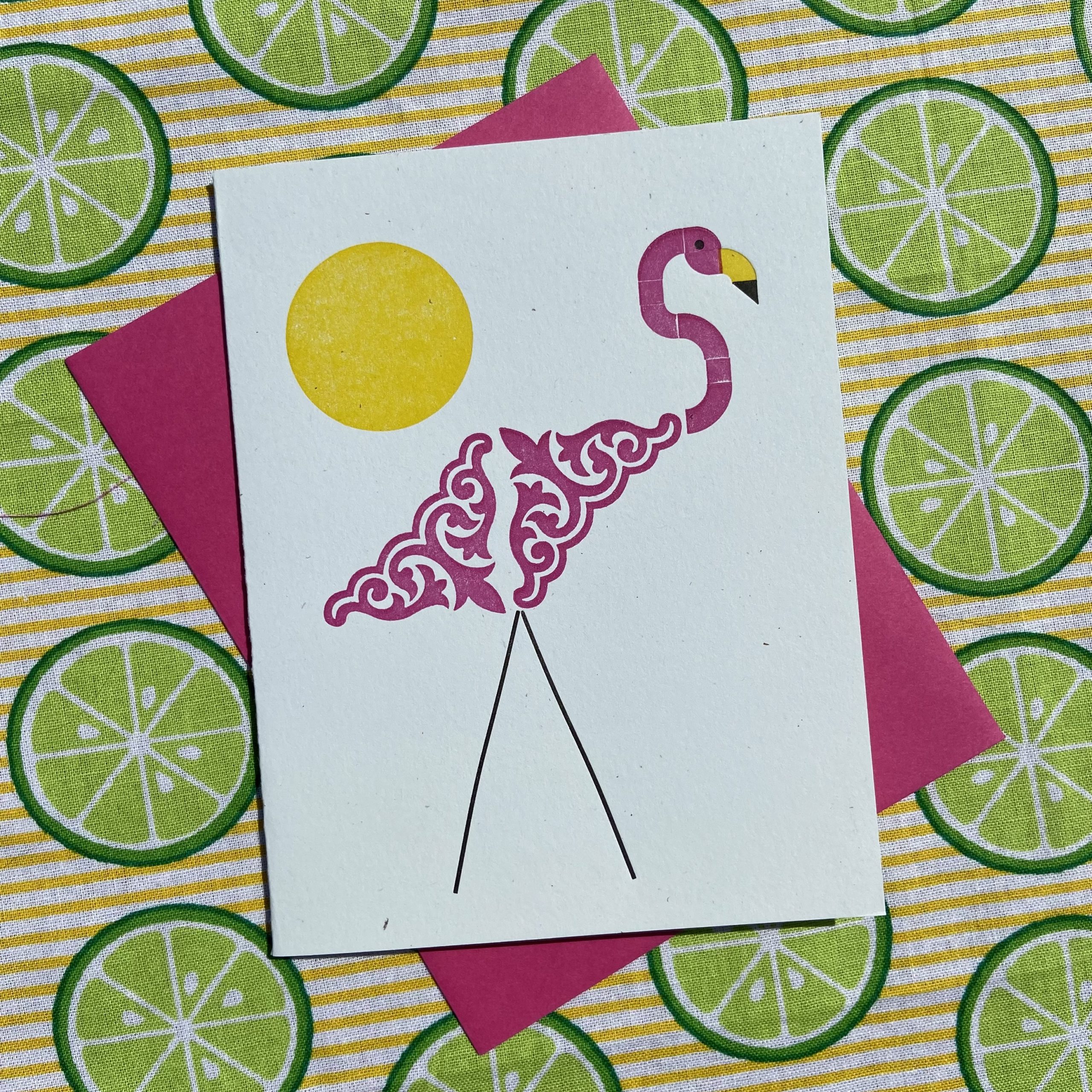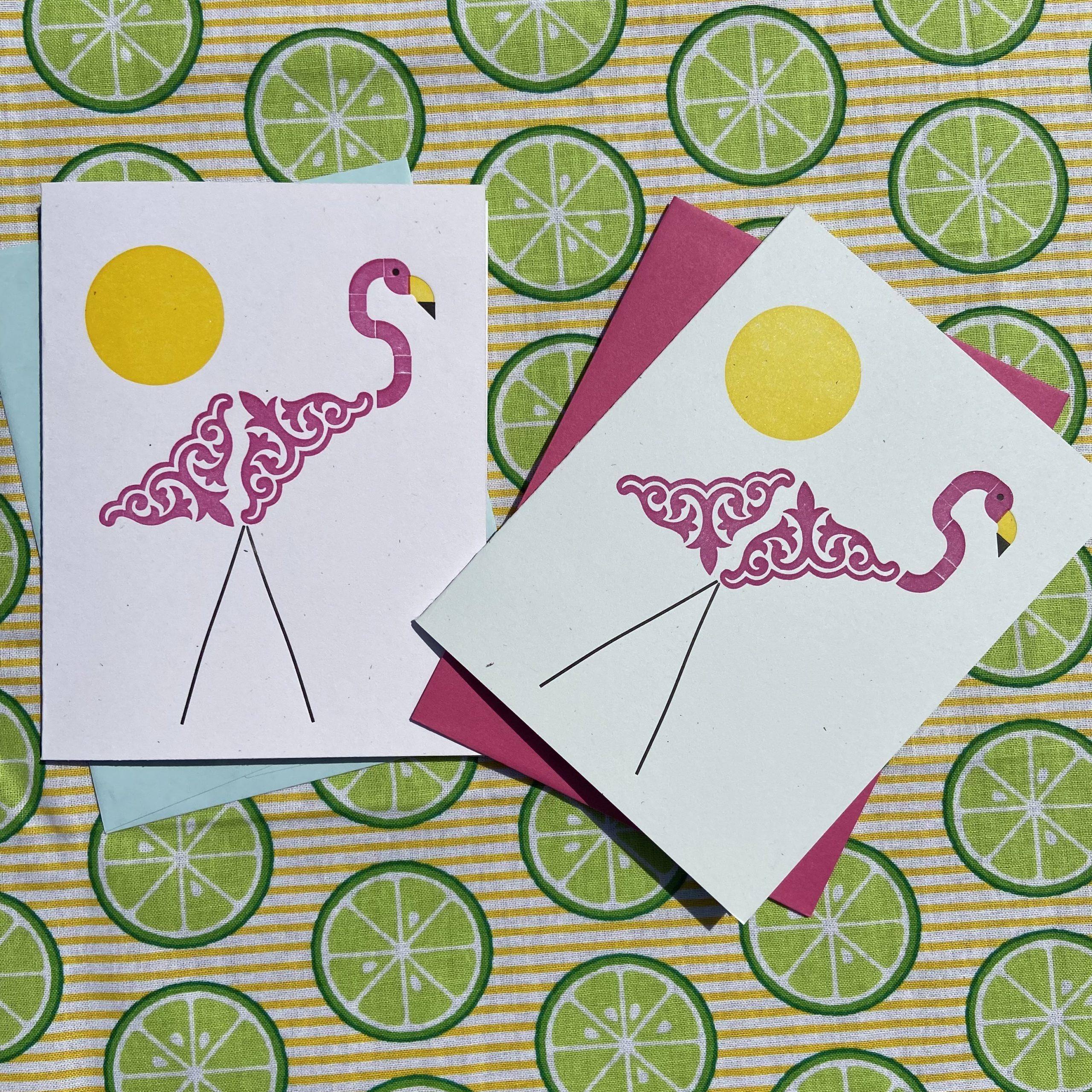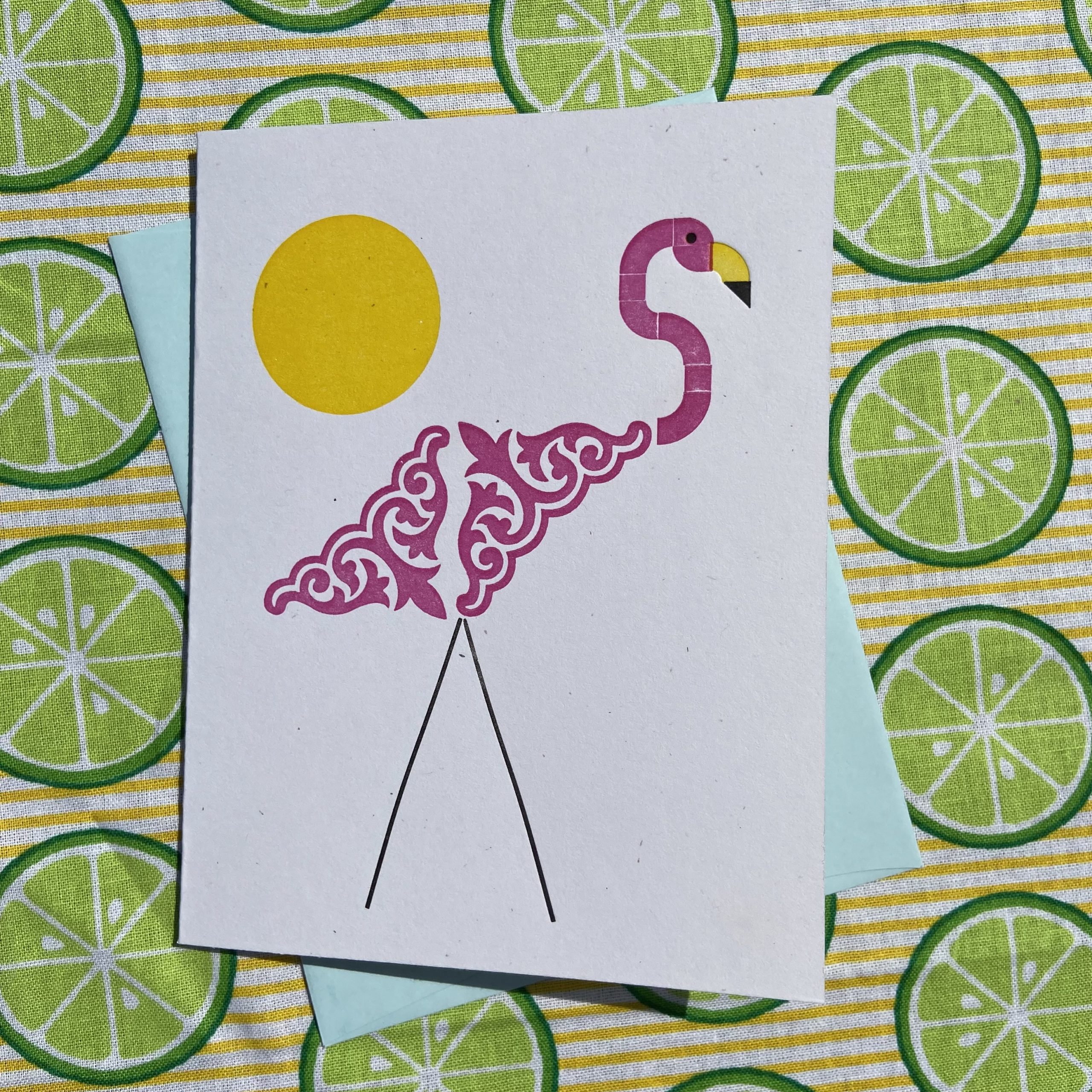 It is perhaps not well-known outside of Madison, Wisconsin, that our official city bird  (enacted by the city council in 2009) is the Plastic Lawn Flamingo, in homage to a locally famous prank played by the Pail and Shovel Party at UW-Madison in 1979. It’s the reason our local soccer team, Forward Madison, has a Flamingo for their logo. This card is my tribute to this icon of American goofiness, printed entirely with hand-set type, including a pair of wood corner ornaments, some brass rule, and a handful of metal type in basic geometric shapes, and a fair amount of fussing to getting everything lined up just so.