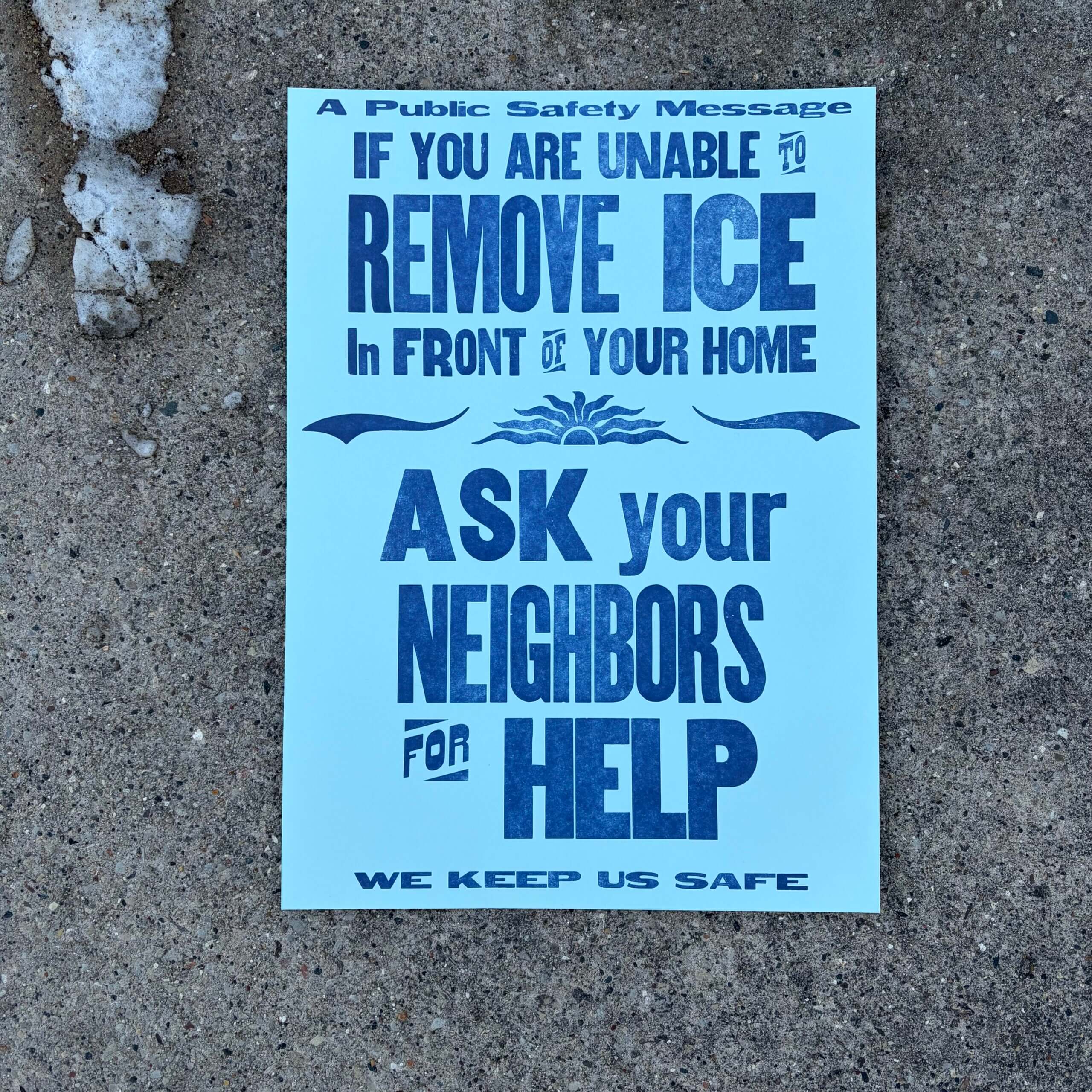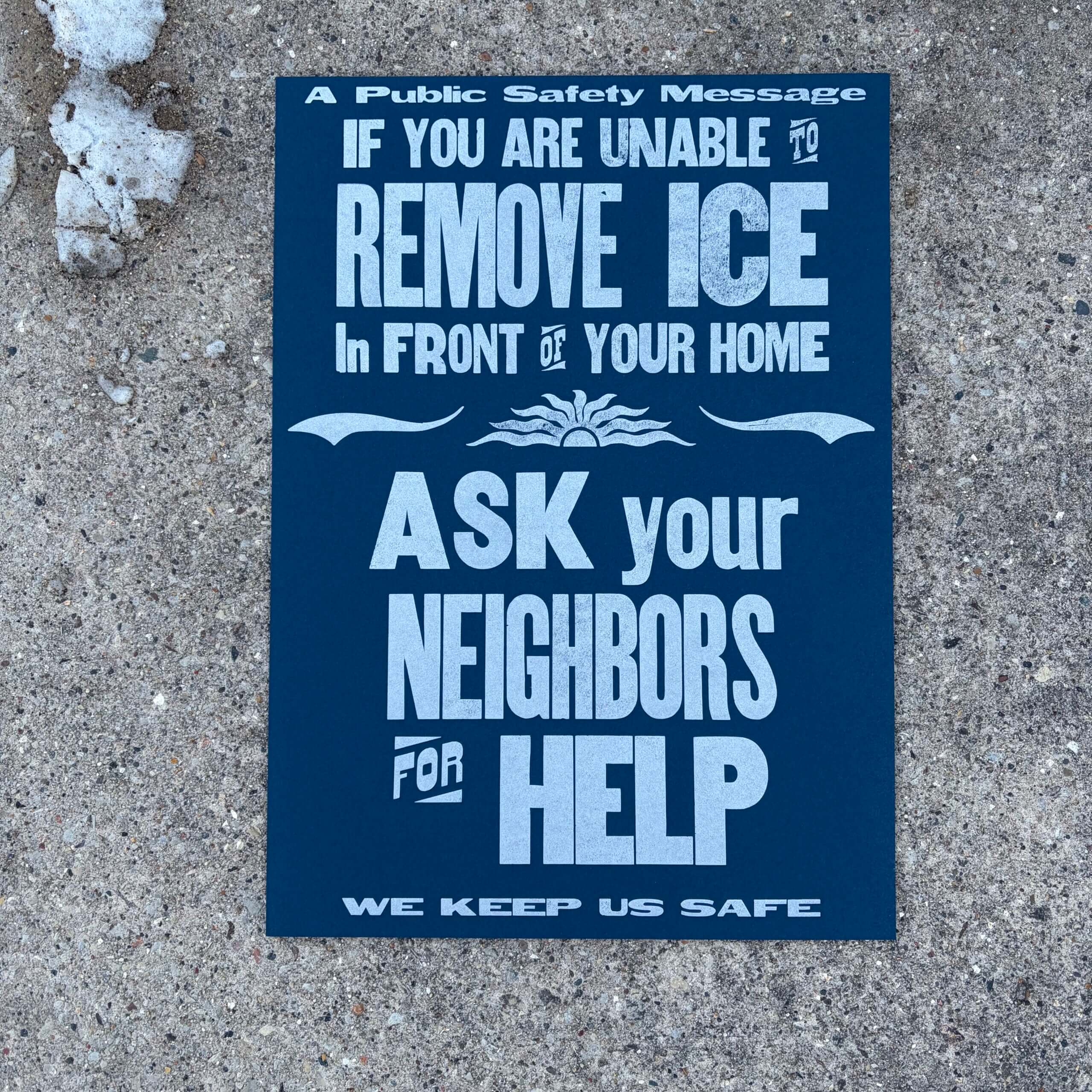 If you are unable to remove ice in front of your house, ask your neighbors for help. 12.5” x 17.5” print on 80lb cover paper in either midnight with silver ink or ice blue with metallic blue ink. The third in this series of prints inspired by the messages I get from my city after every snowfall, and by the community care demonstrated all over the midwest by neighbors helping each other dig out after winter storms.