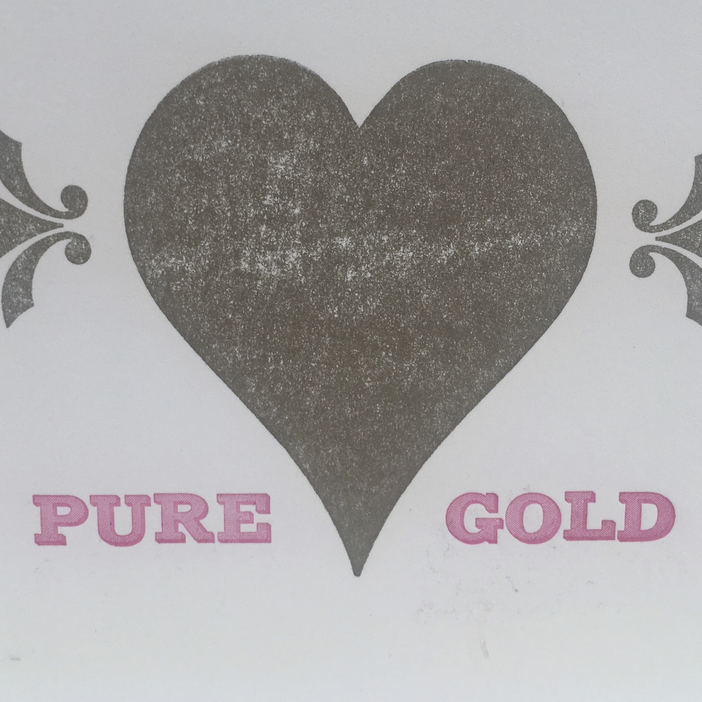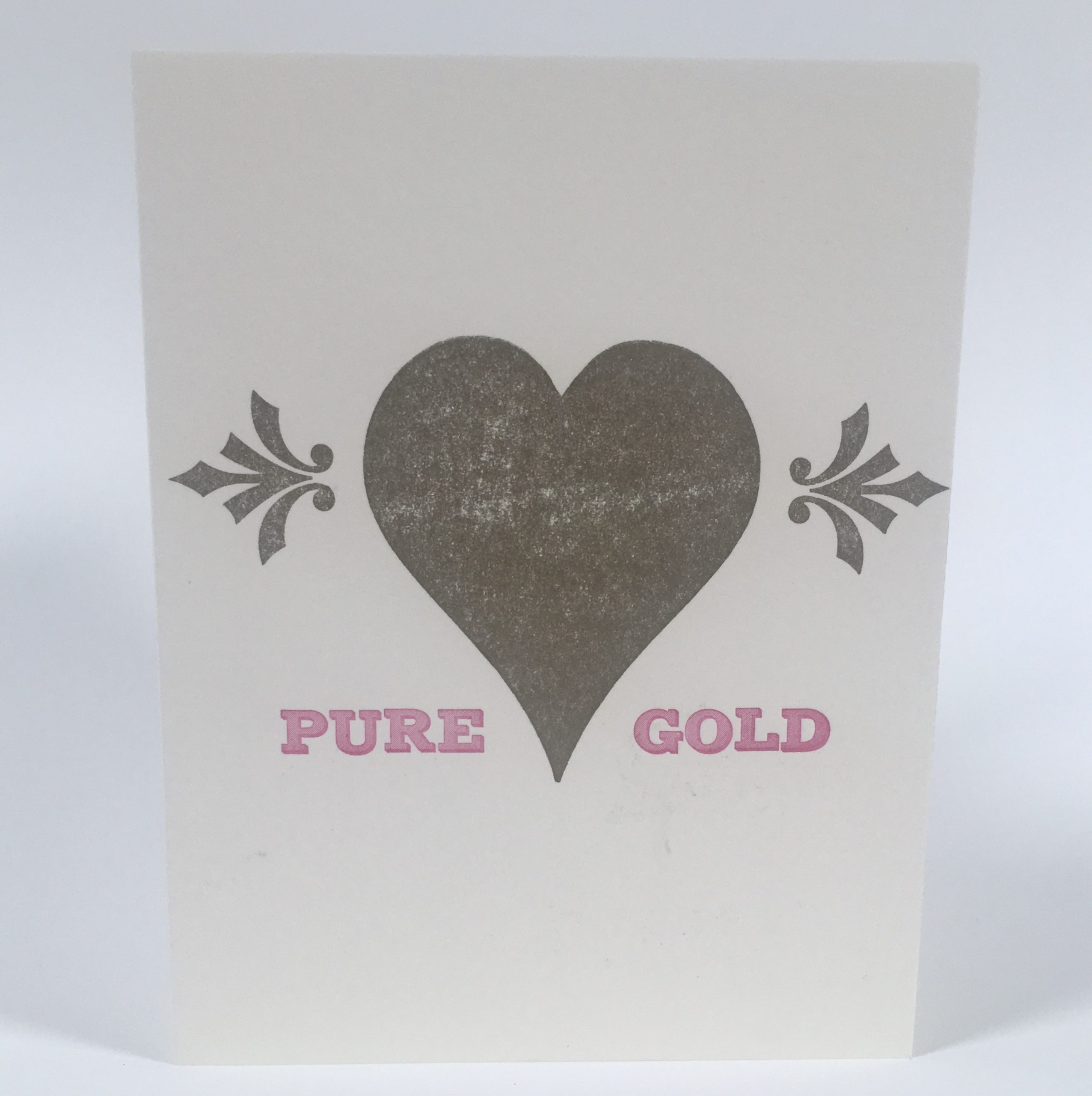 Know someone with a heart of gold? Let them know! Or use this card to celebrate a friend’s accomplishment.Letterpress printed in pink & gold ink on cream-colored 118# heavyweight cotton card stock. A2 (5.5″ x 4.25″) sized folded card with matching envelope. Printed by hand in Madison, Wisconsin using metal and wood type.
