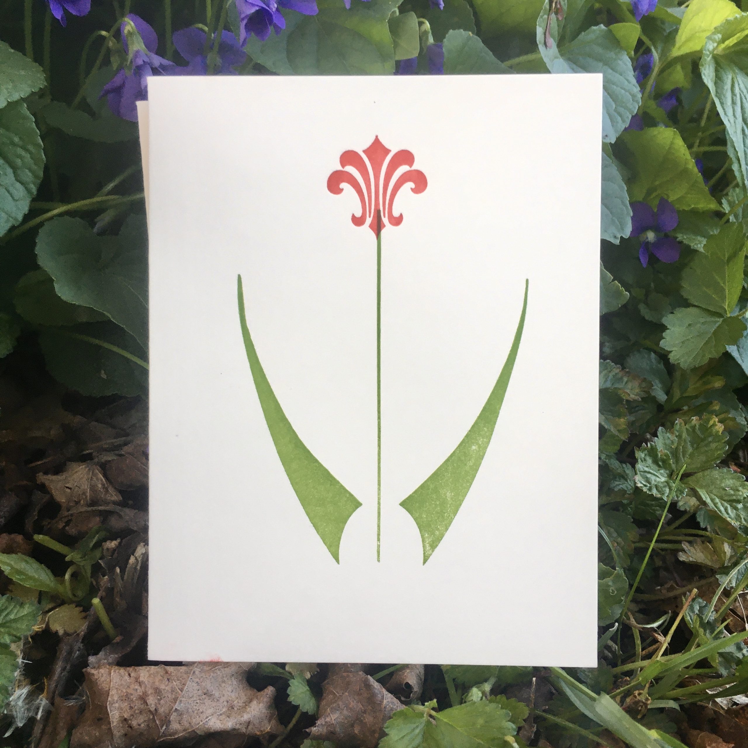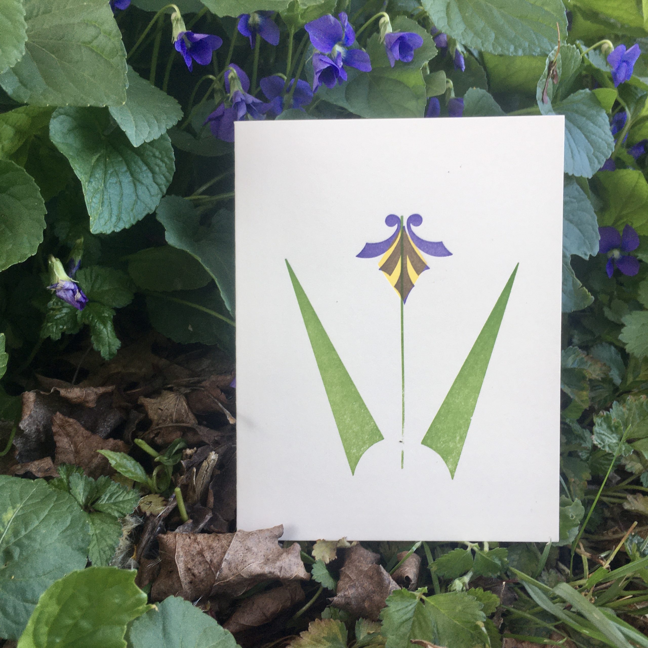 A set of four card designs, inspired by spring flowers: Iris, tulip, bluebells, and the humble dandelion. Letterpress printed using hand-composed wood type, metal type and brass rule on off-white A2 sized folded heavyweight cardstock.
