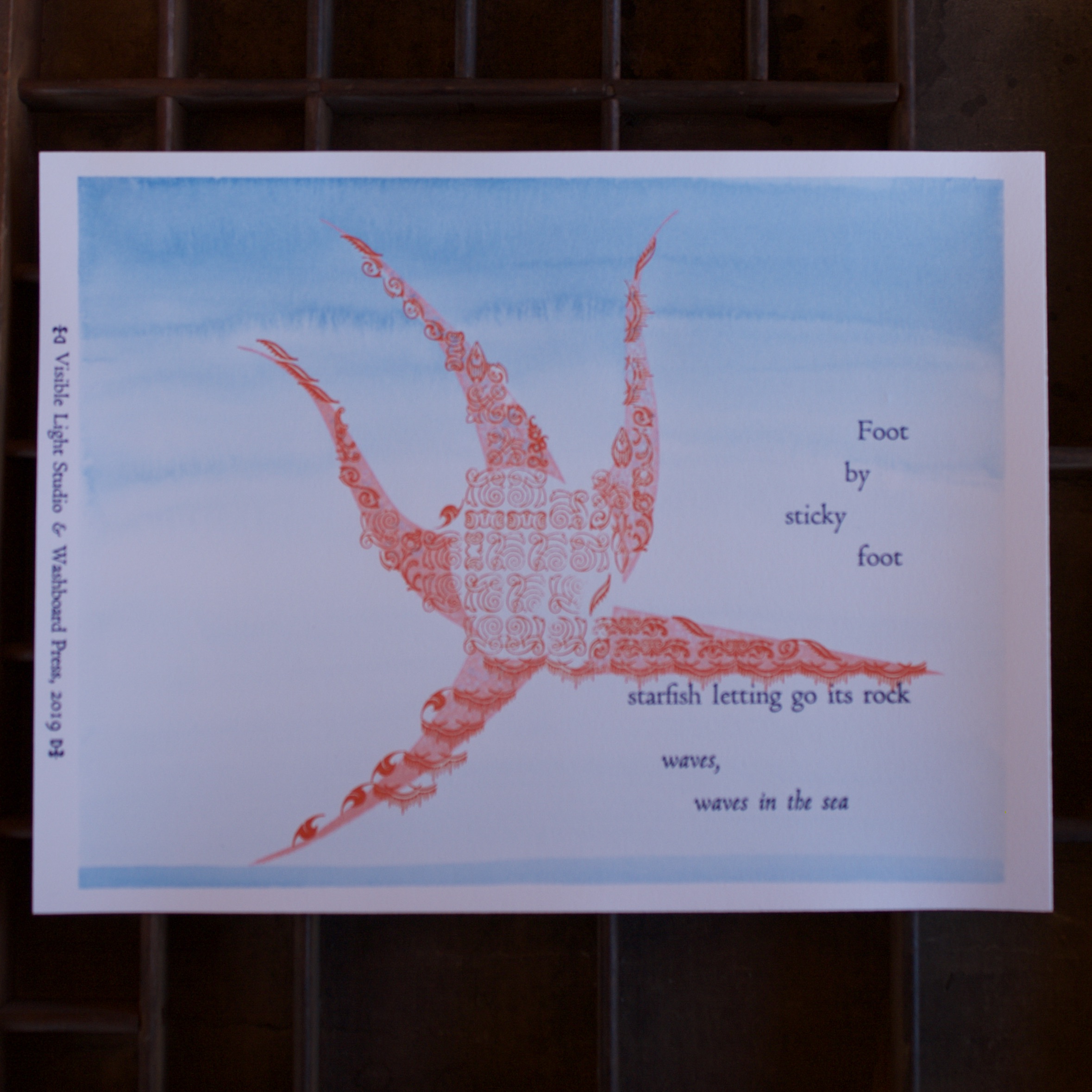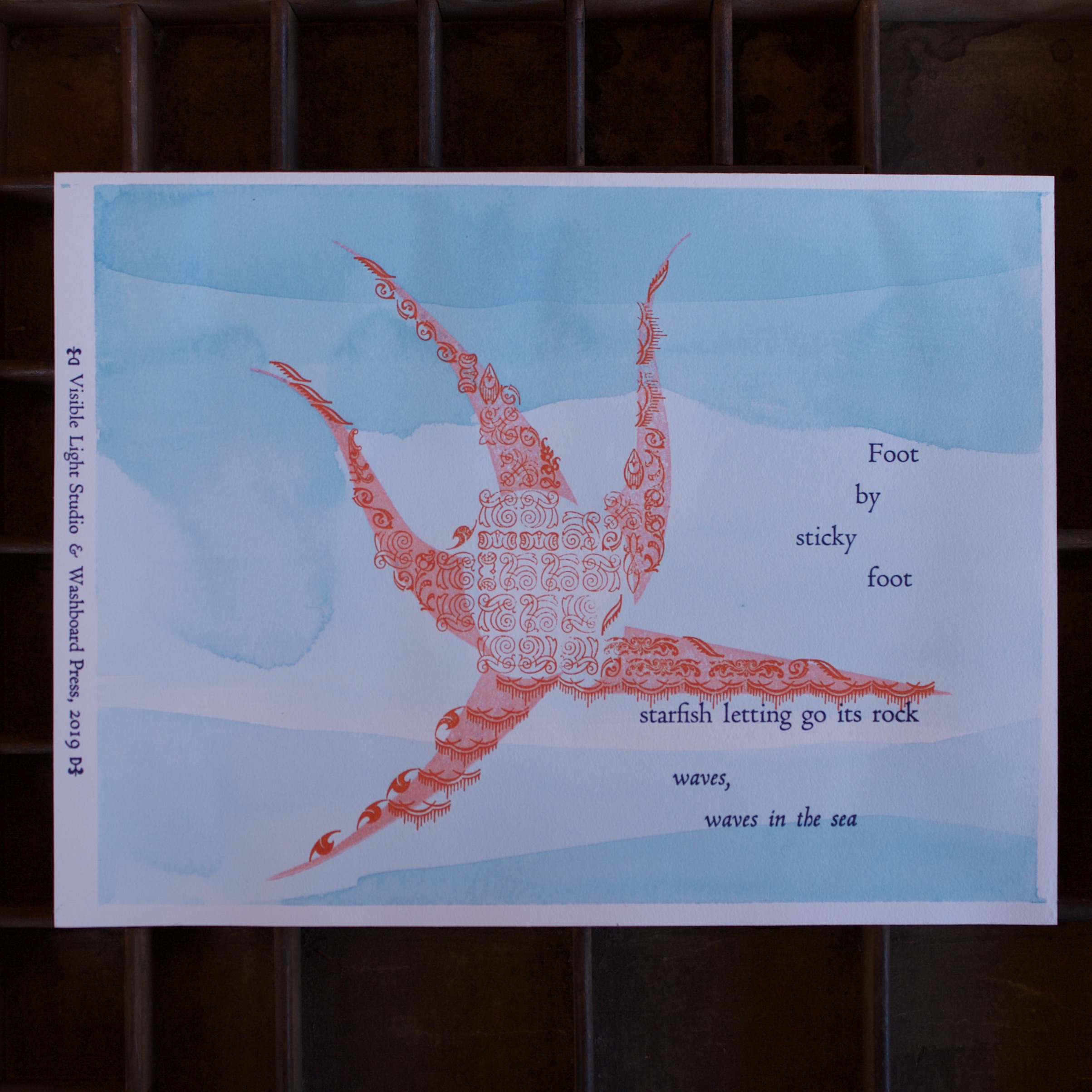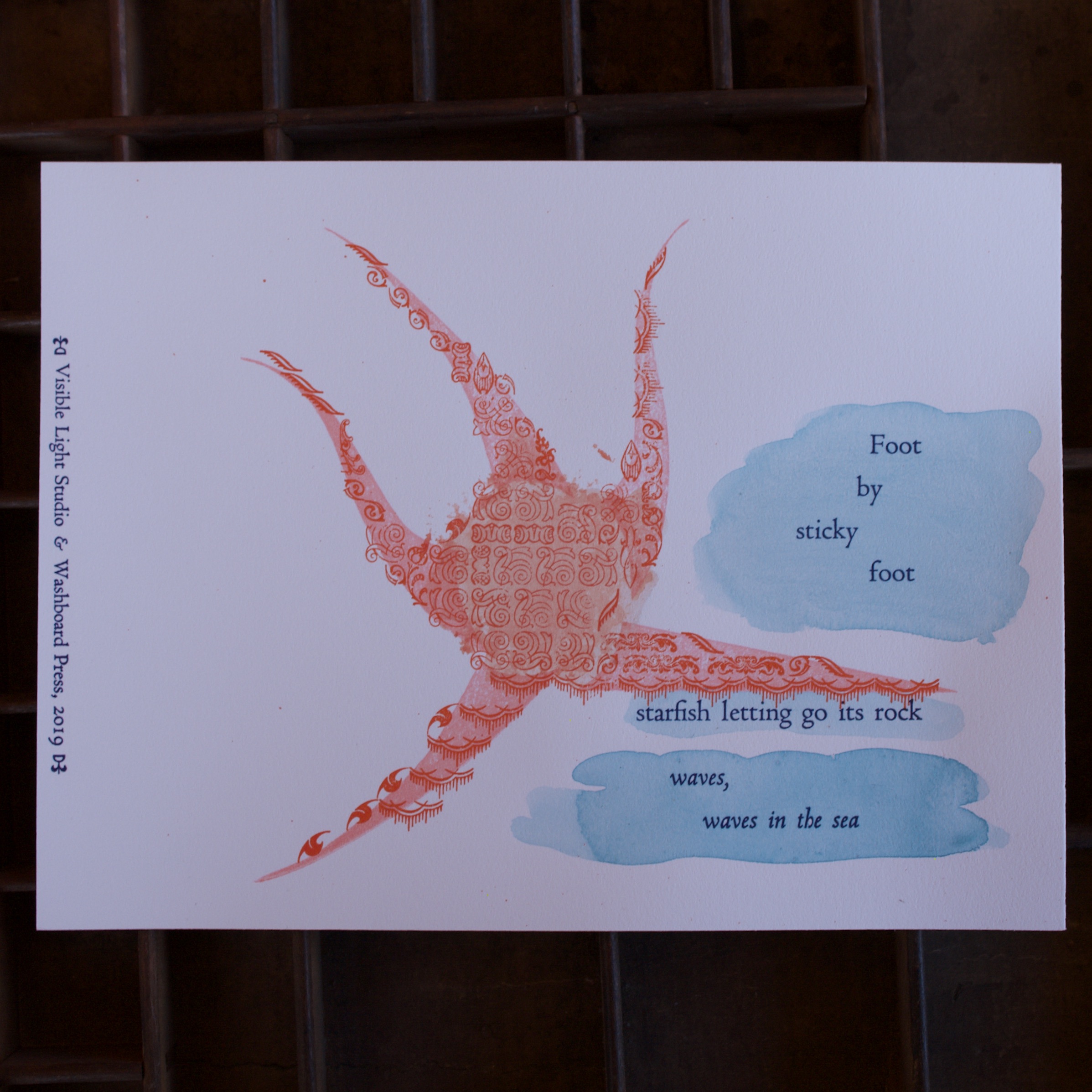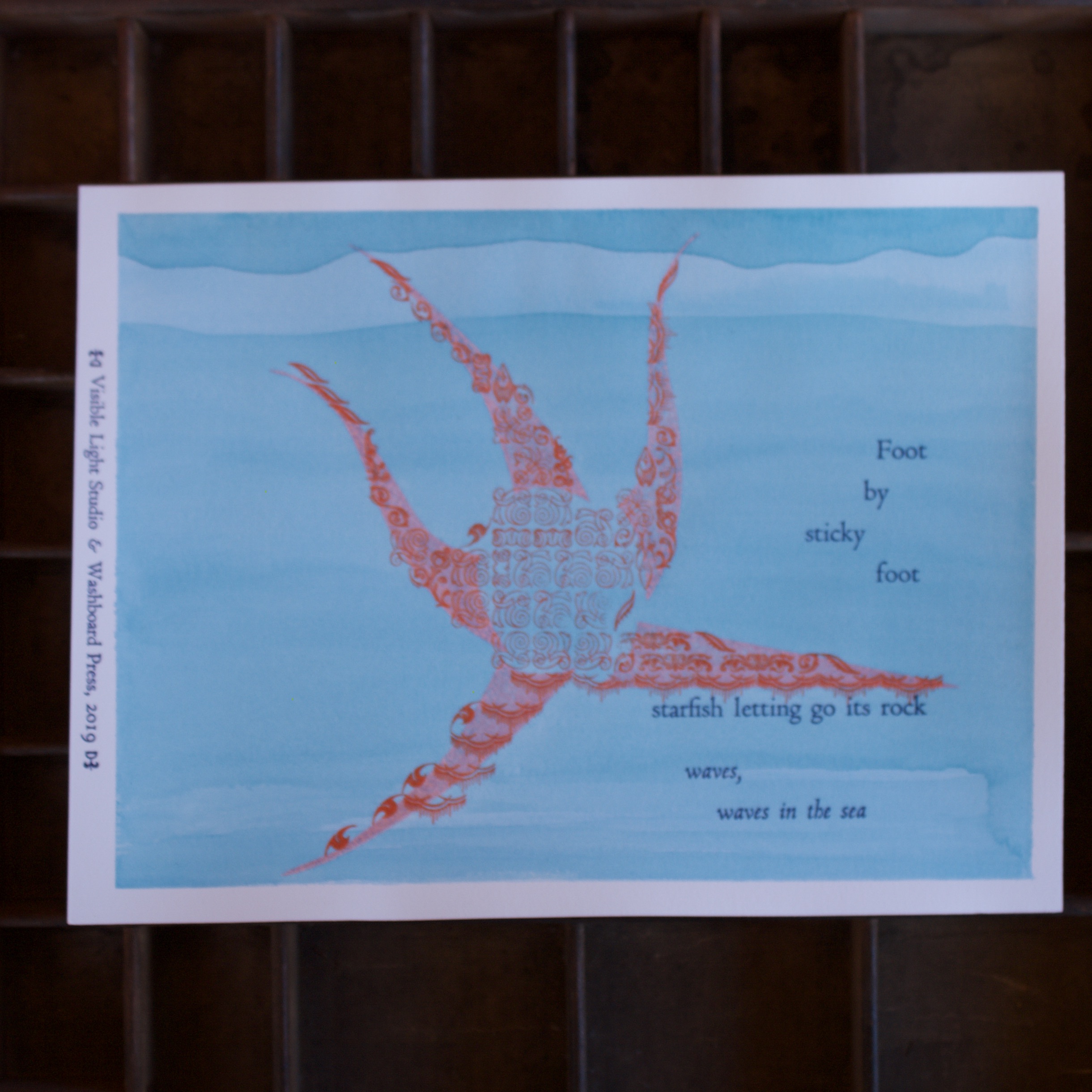 A collaborative effort with Visible Light Studio of Columbus, Ohio. Sarah wrote several haiku, sent them to me, and I selected some of them and printed some settings of them. Once printed, I shipped them back to her and she added some unique watercolor magic to each one.