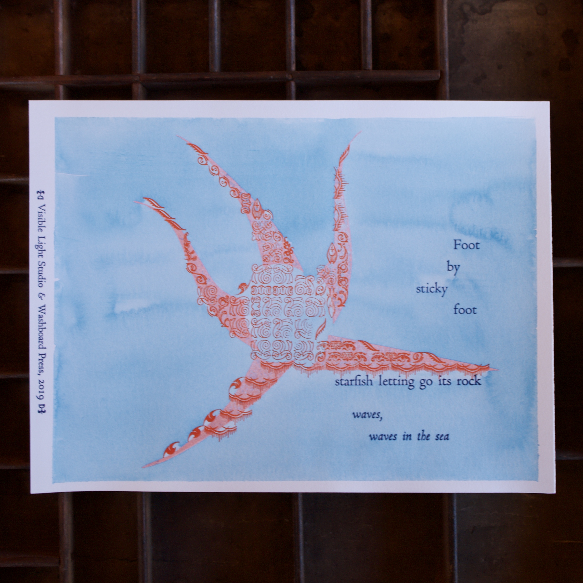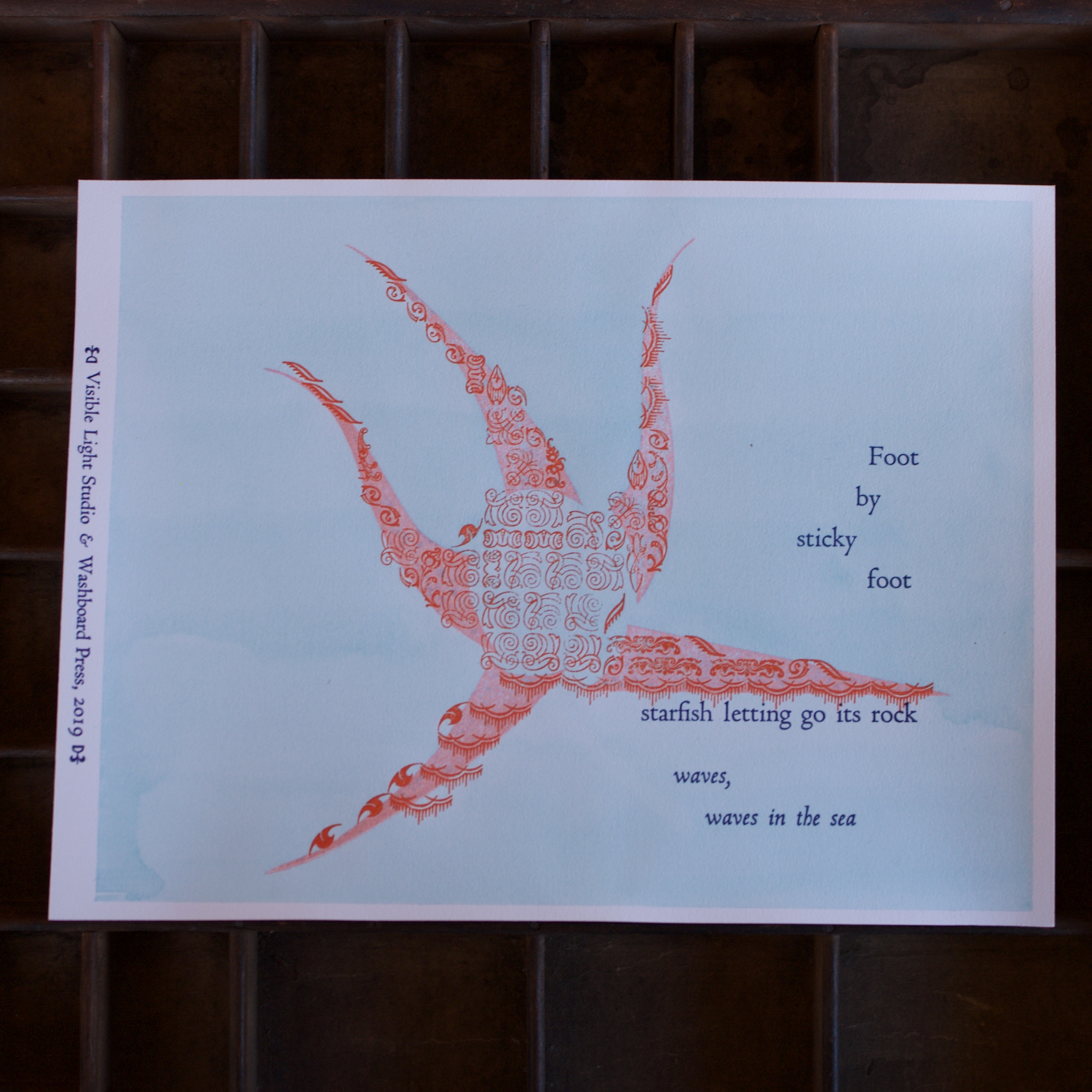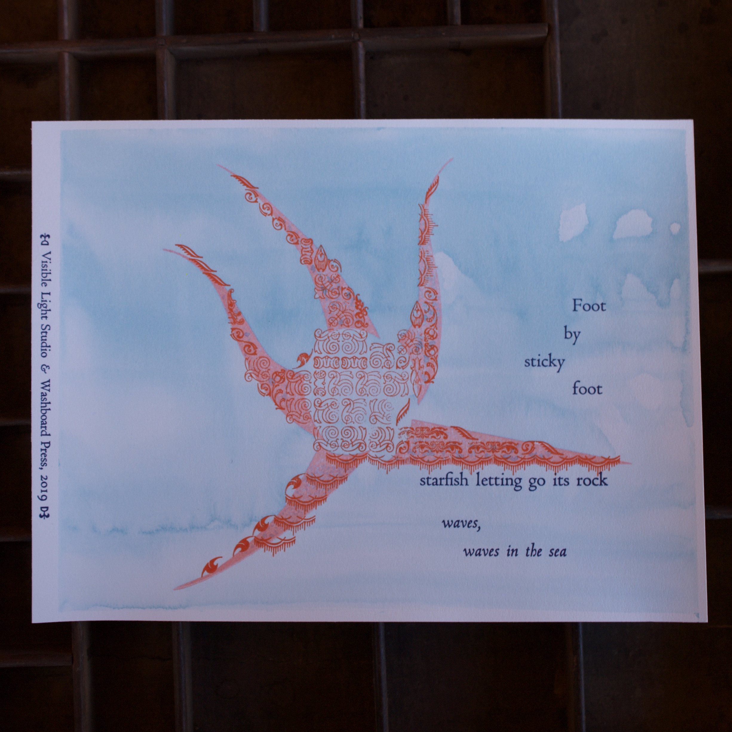A collaborative effort with Visible Light Studio of Columbus, Ohio. Sarah wrote several haiku, sent them to me, and I selected some of them and printed some settings of them. Once printed, I shipped them back to her and she added some unique watercolor magic to each one.