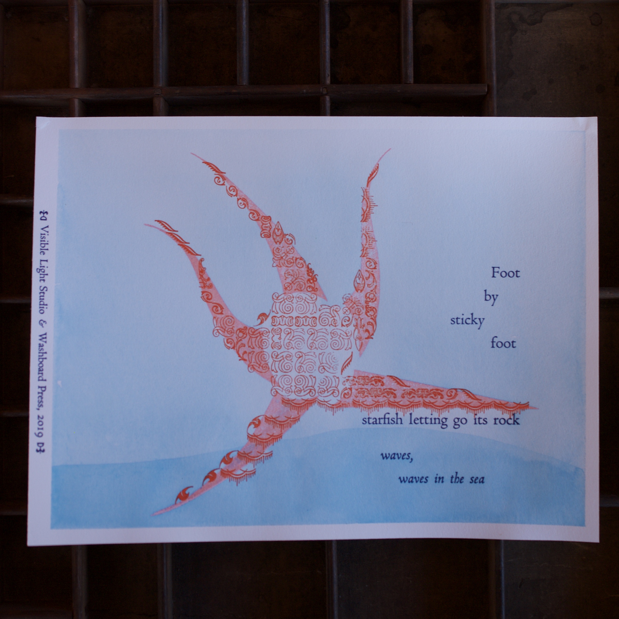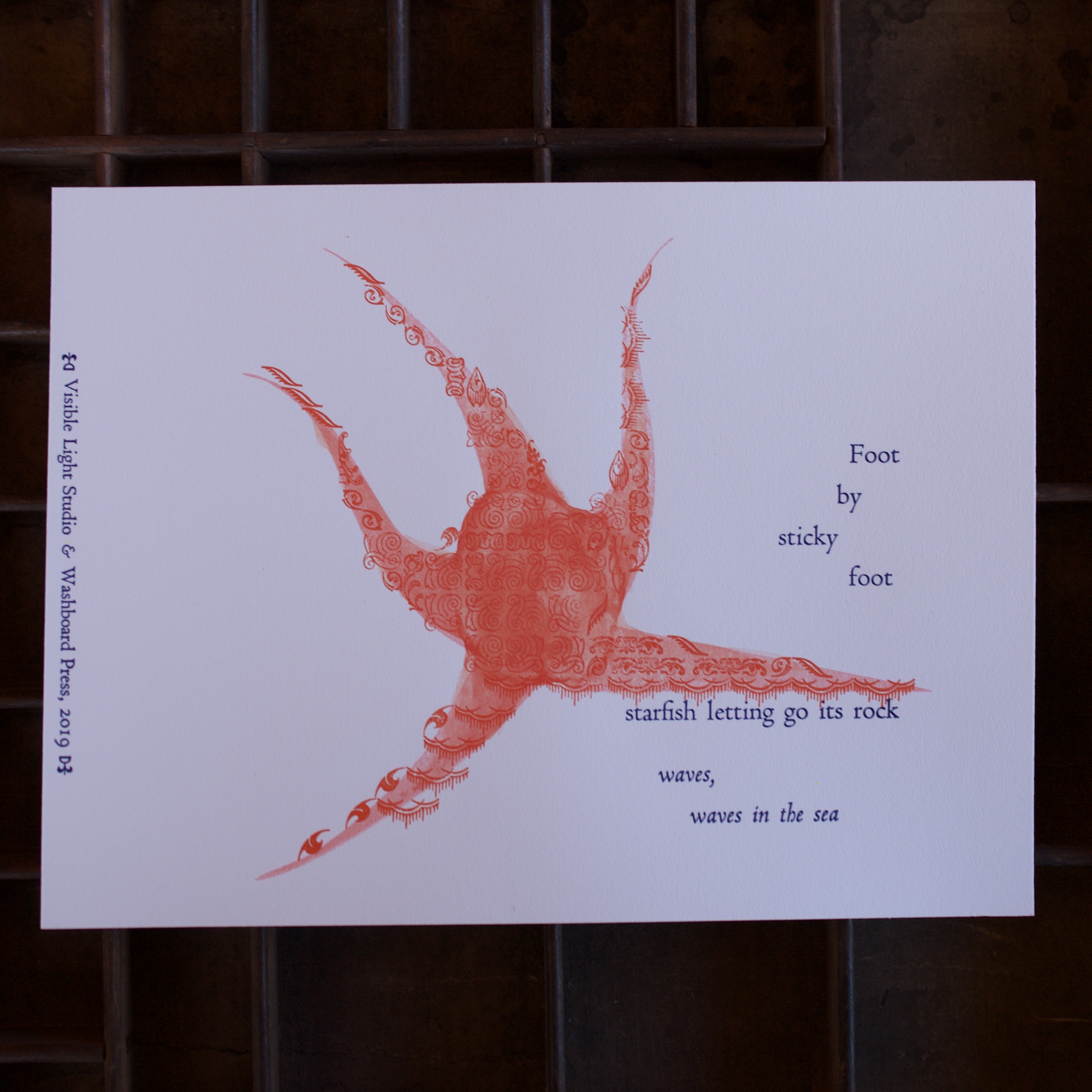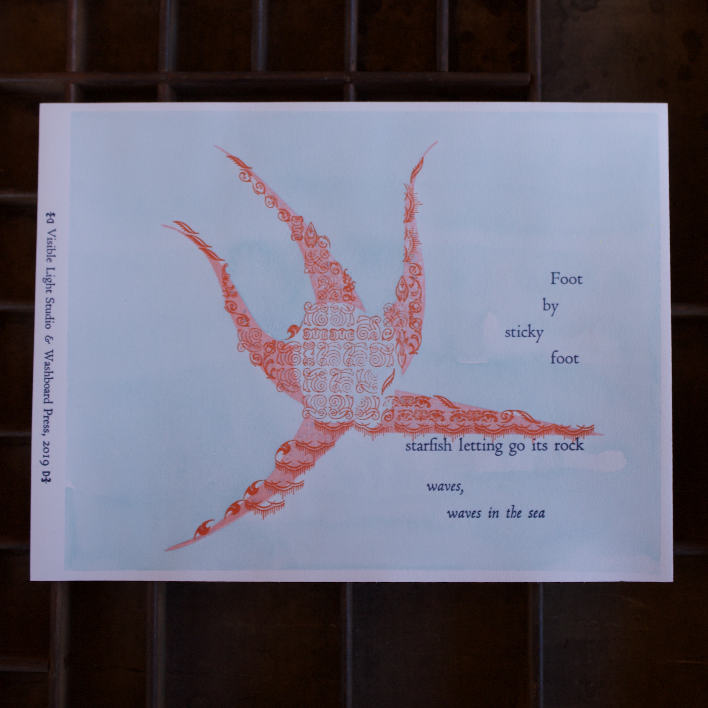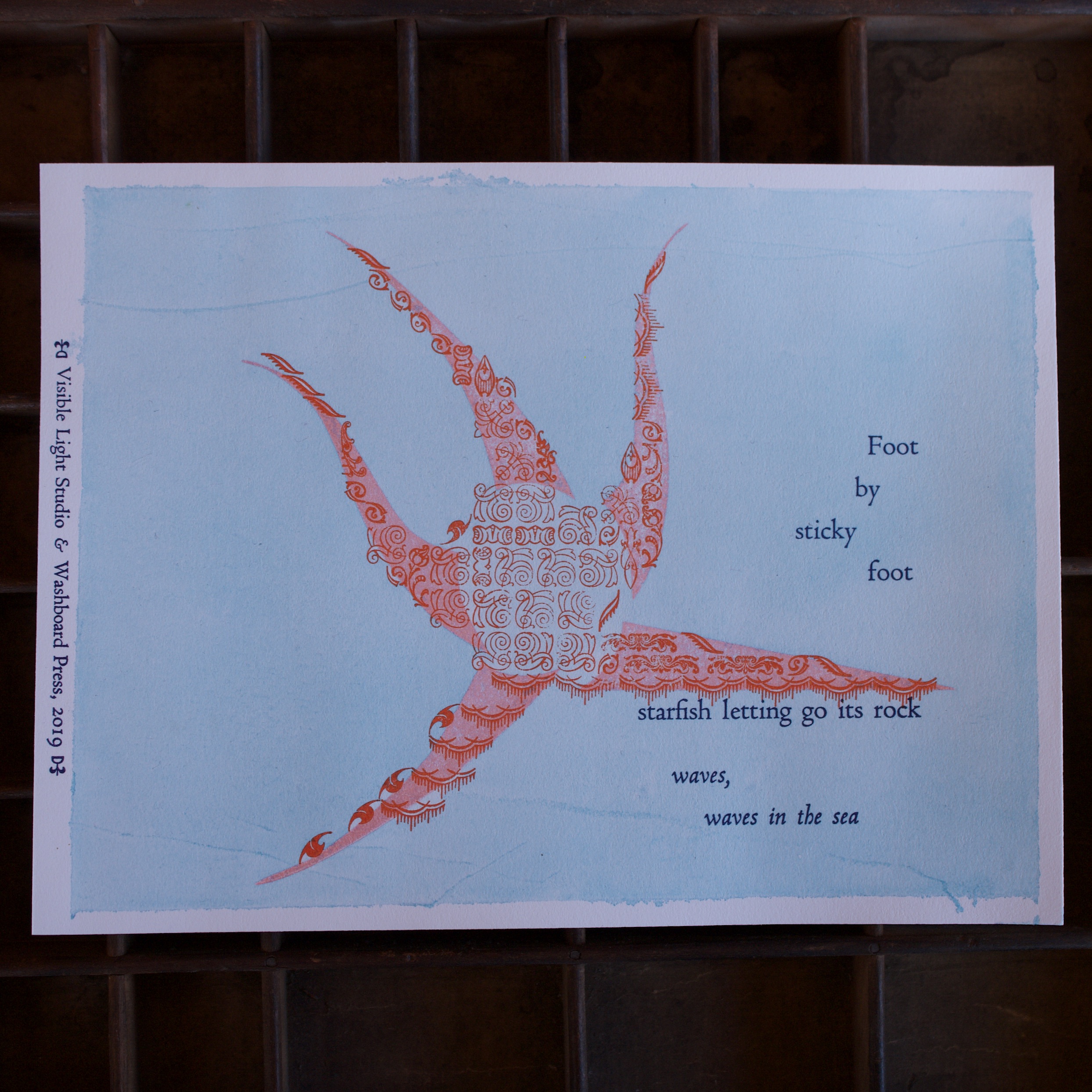 A collaborative effort with Visible Light Studio of Columbus, Ohio. Sarah wrote several haiku, sent them to me, and I selected some of them and printed some settings of them. Once printed, I shipped them back to her and she added some unique watercolor magic to each one.