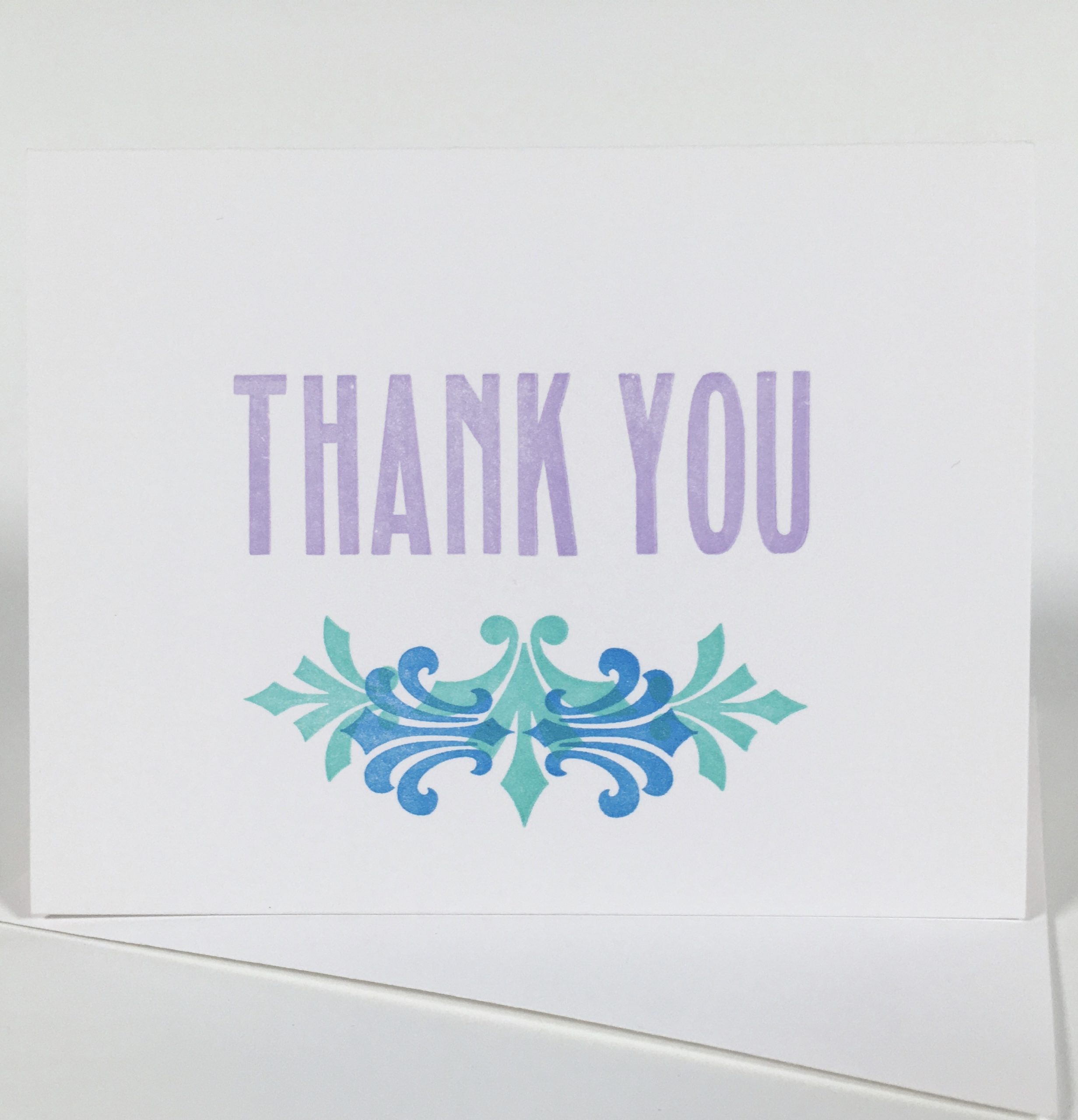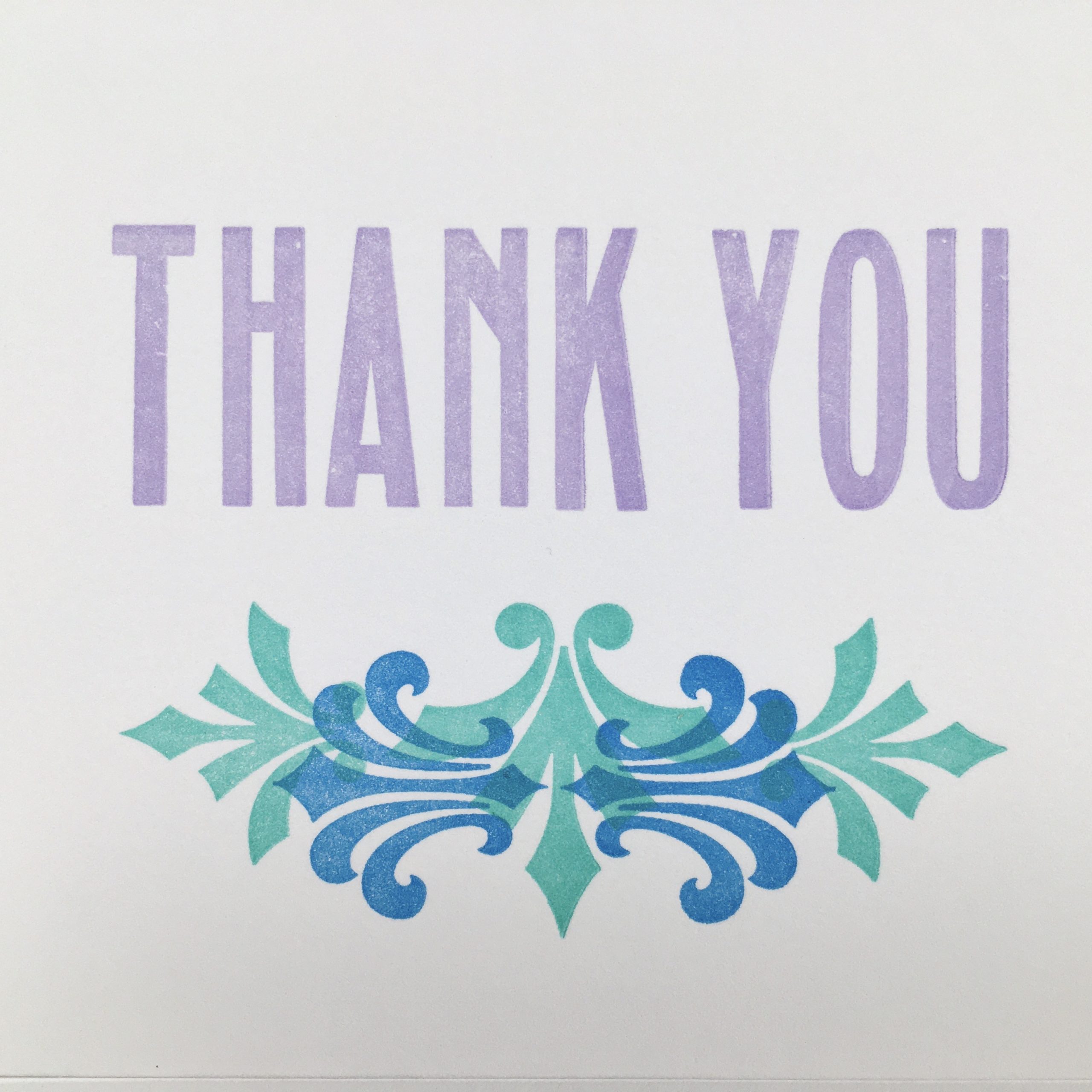 A simple and elegant thank you card using Art Deco style ornaments and type in more contemporary colors to create a card both modern and classic. Letterpress printed in violet, blue and green ink on bright white 118# heavyweight cotton card stock. A2 (5.5″ x 4.25″) sized folded card with matching envelope. Printed by hand in Madison, Wisconsin using wood type.